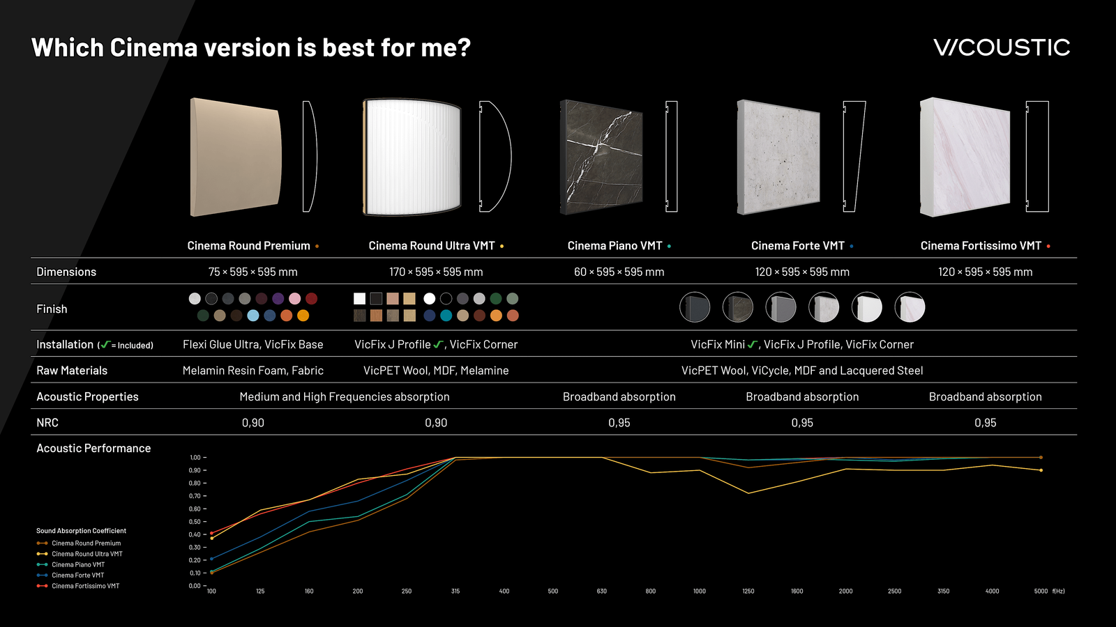 Both Cinema Forte VMT and Fortissimo VMT have one of the best acoustic performances achieved by Vicoustic, becoming new top-of-the-range sound absorbers, even when compared to Cinema Round Premium and Cinema Round Ultra.