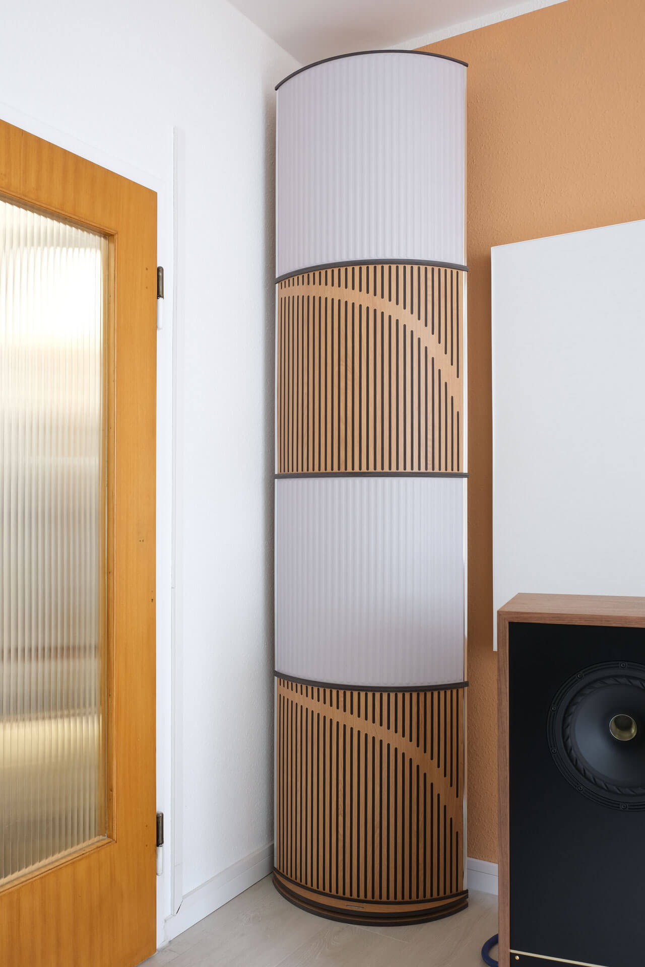 Vicoustic's VicTotem Ultra VMT are free-standing acoustic elements that can perform different tasks: absorption, diffusion and bass management, as well as a combination of these properties. They consist of a base plate and pointed-oval elements, each 665 millimeters high, 675 millimeters wide and 395 millimeters deep. The elements have two different sides. If the fabric-like VMT side of the modules faces forward, the elements serve as sound absorbers. If the high-pressure laminate wood side faces forward, they act as a diffuser. Set up in the corners of the room, they serve as bass traps. With the help of additional modules, the VicTotem Ultra VMT can be adapted to the room height.