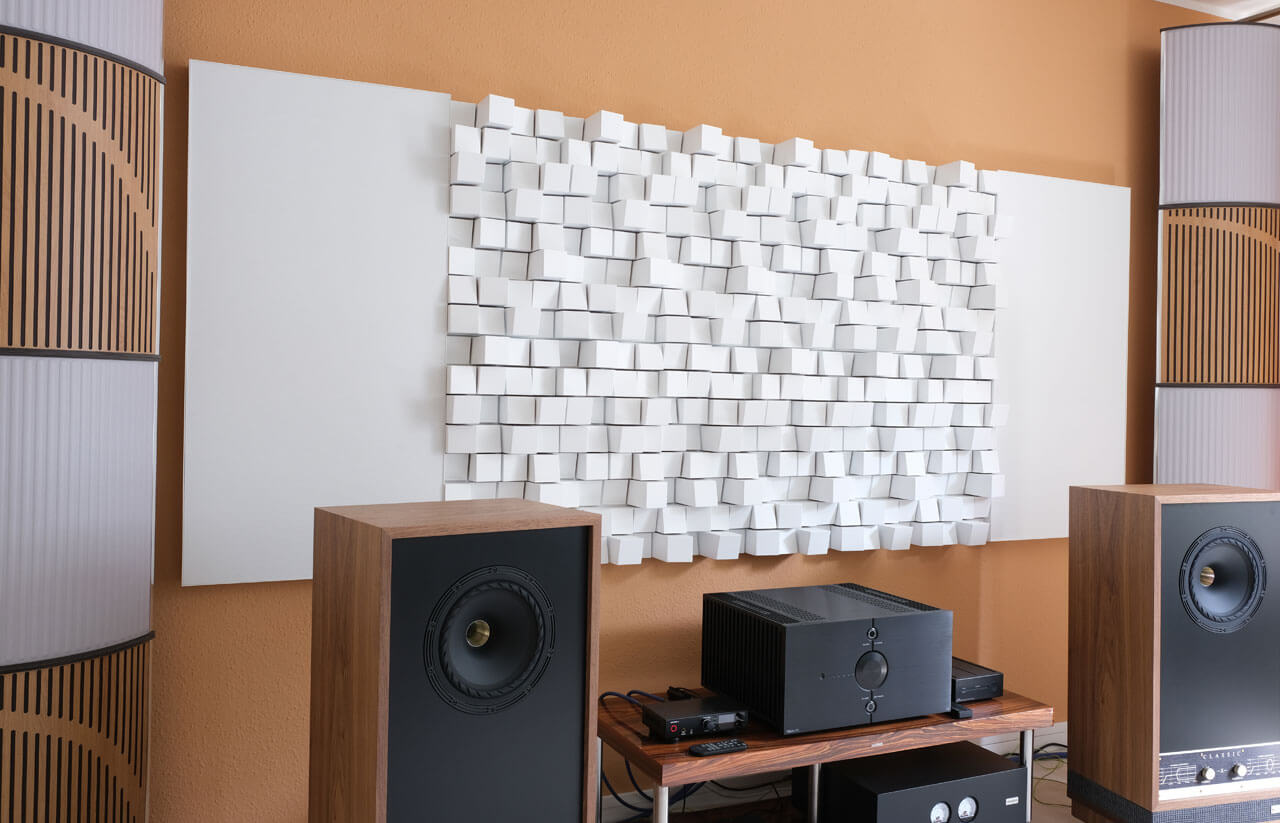 I start by assembling the large VicTotem Ultra VMT modules, which are simply placed behind the speakers in the corners of my listening room. The individual elements can act as absorbers or diffusers, depending on which side is facing forward.