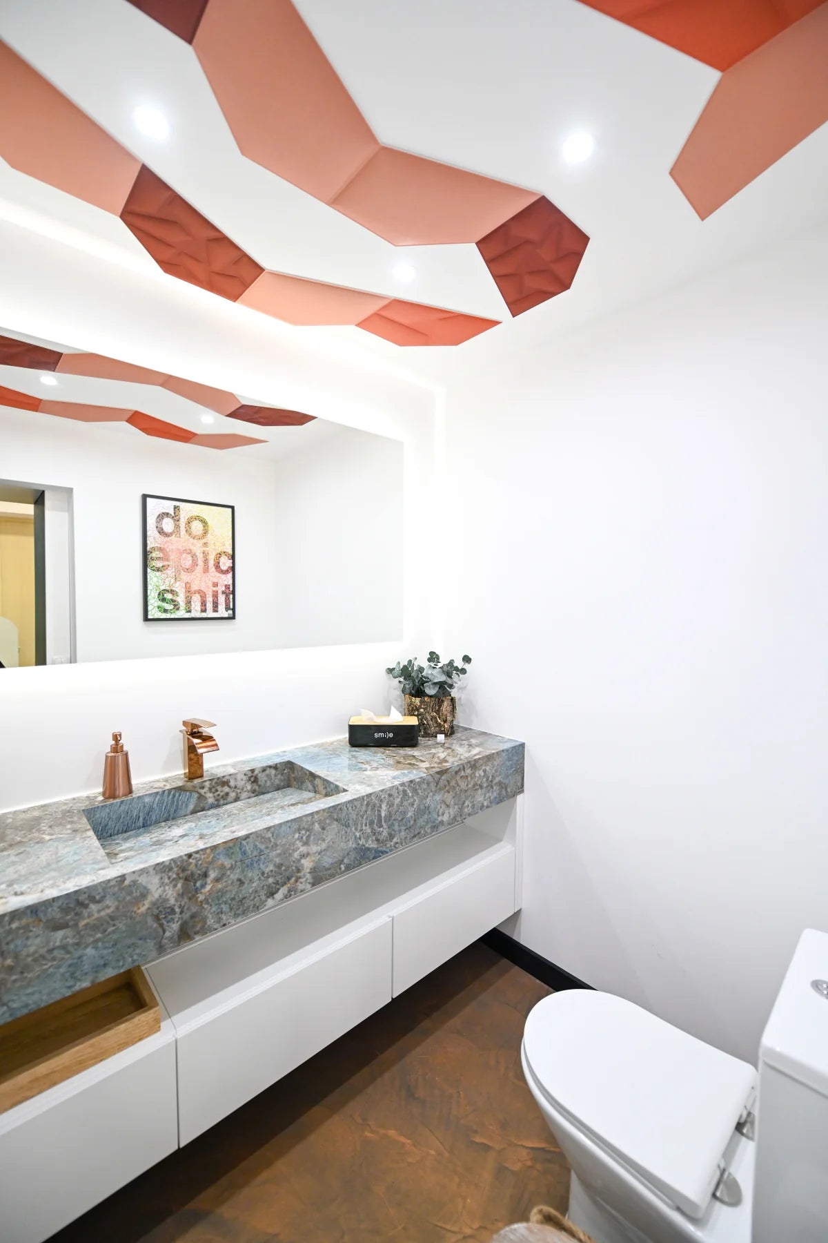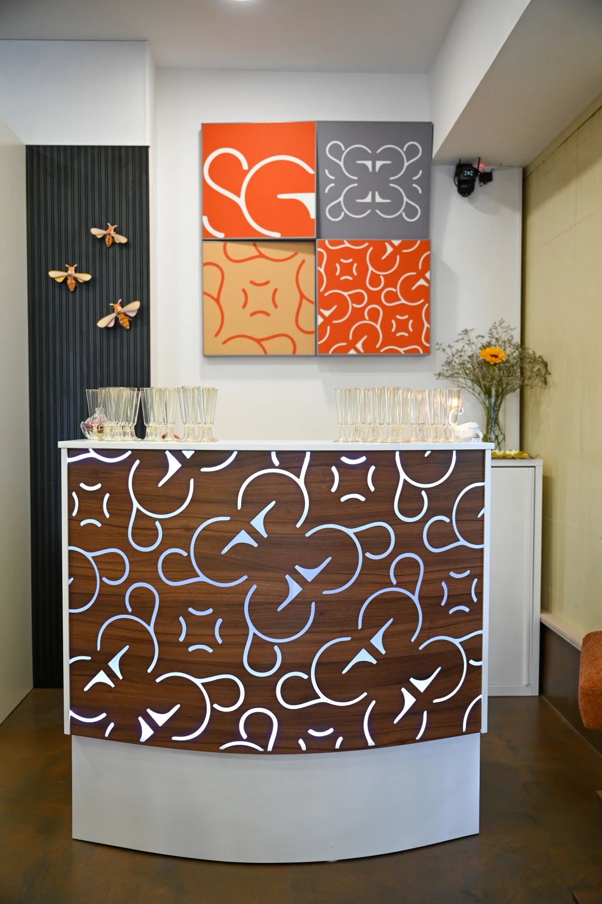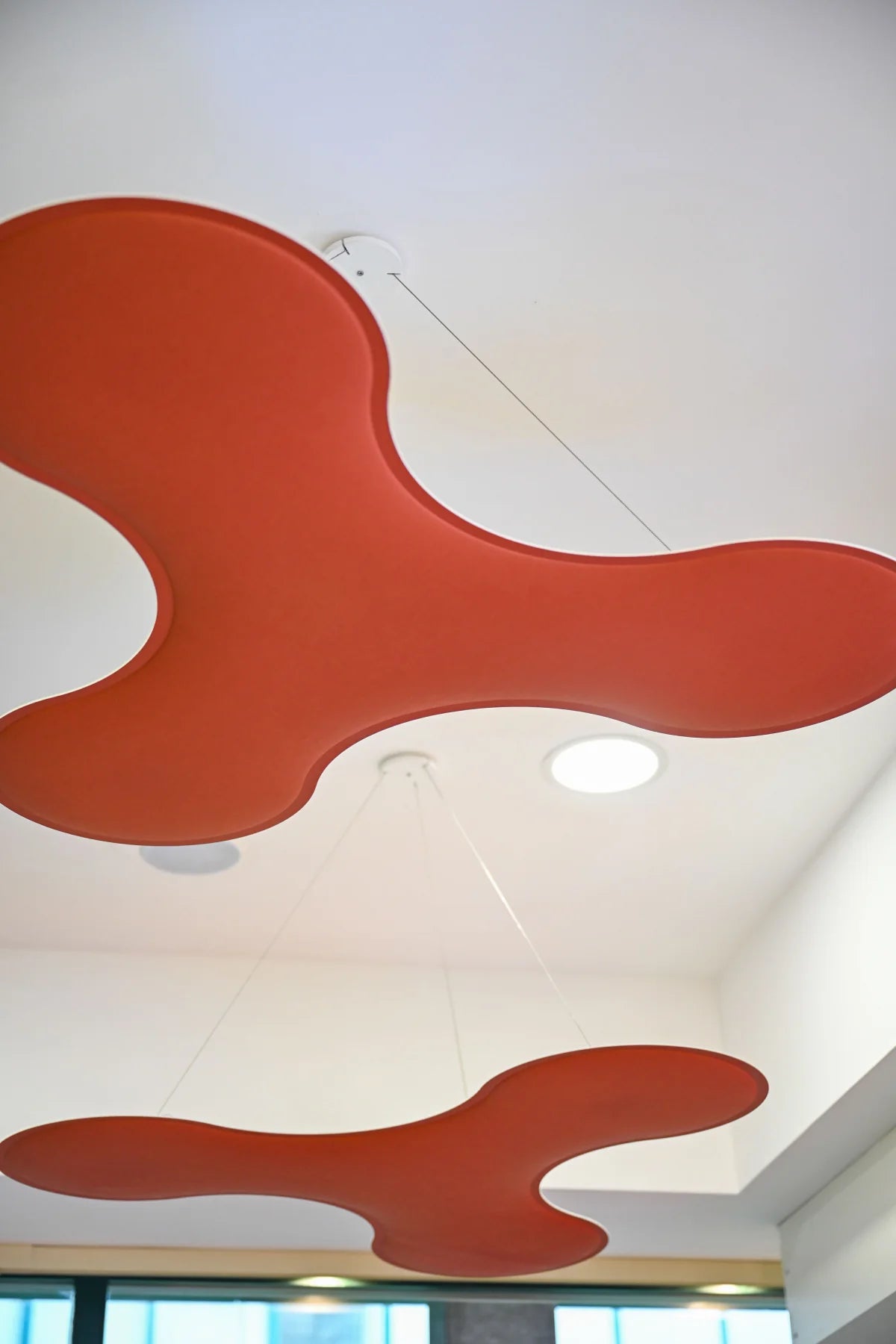 Bespoke Cinema VMT panels were produced with the signage of the store. Other acoustic panels were strategically chosen according to their colours: VicStrip in White, Garnet Red and Black Matte, ViCloud VMT 3D in orange, VicShape 3D in Grey and GEN_VMT Tiles in Coral patterns.