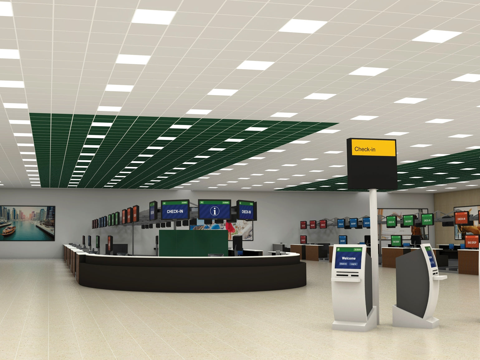 Flat Panel VMT can be used to identify different areas using color codes and signs. This will help travellers find the right way to specific airport areas. By changing the design, one will be able to create different atmospheres for each area. This VMT versatility enhances airport communication, making people feel more confident and less stressed, while addressing airport acoustics.