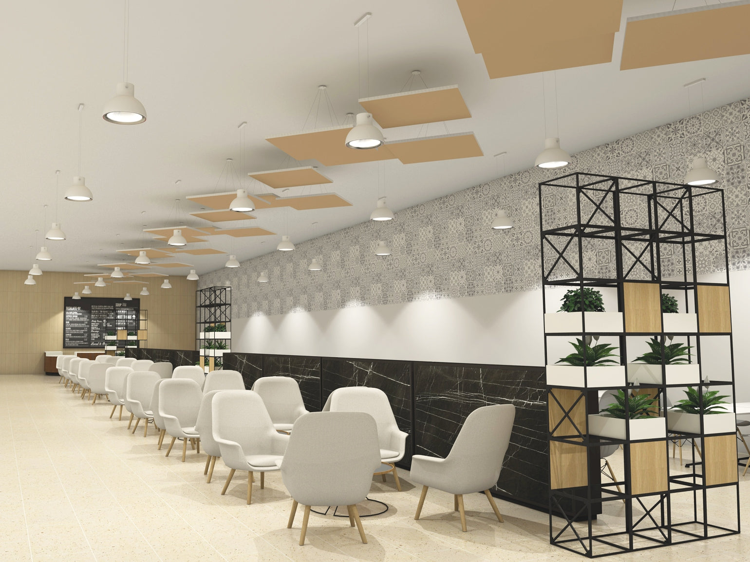 ViClouds VMT are extremely efficient suspended elements that can be used to control the room’s reverberation and any strong sound reflections from the ceiling. ViClouds VMT are a simple and lightweight suspended acoustic solution that is ideal for spaces, where there is a great concentration of people and where background noise, created by a room full of conversations, can quickly build up.