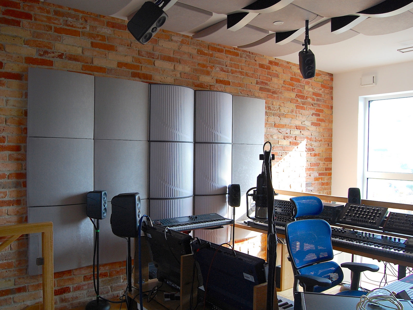 The apartment's owner's goal was to create a home recording studio for electronic music recording, editing and mixing of recordings. An open mezzanine area was intended for this purpose. It required a very strong reduction of reverberation times in the studio part and in the other part of the apartment, open to the studio, below.