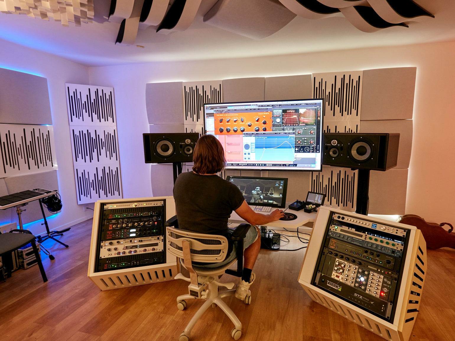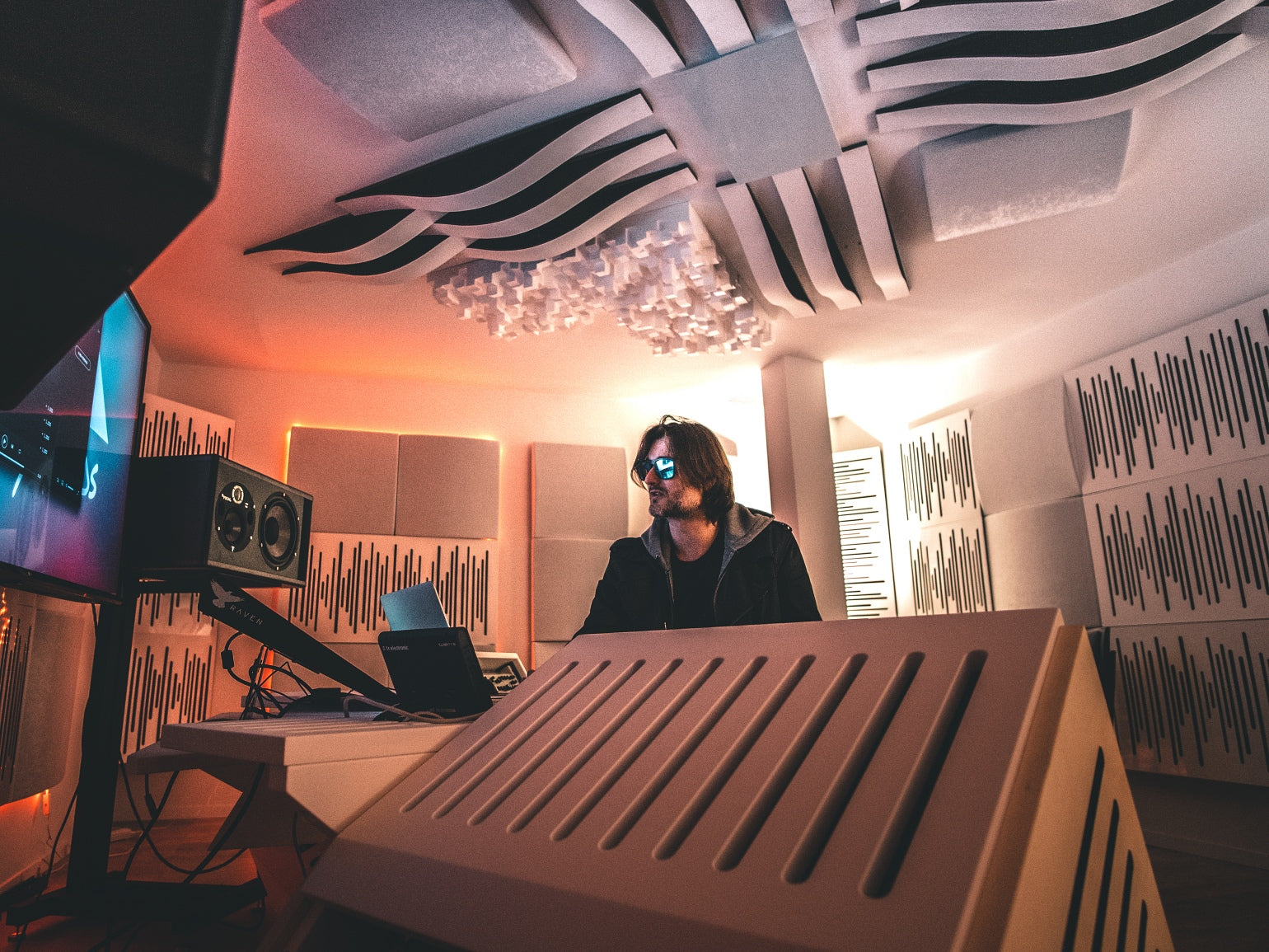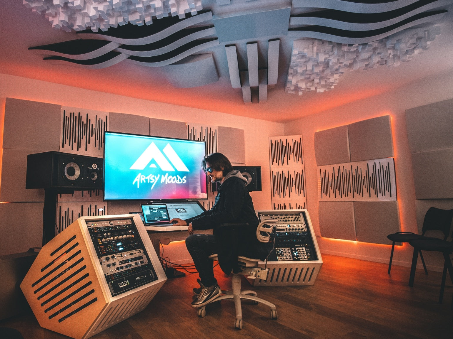 "There certainly is a 'wow factor' when you enter the room, and people are really inspired when they work in this atmosphere, like being in a futuristic spaceship! Right before putting the treatments on the wall we were playing with the incredibly bad flutter echo and huge reverb of the room; after treatment, perfection! Everything was on point", says Artsy Moods. The best part is that "the room isn’t dead sounding; it’s controlled and feels comfortable, not at all unnatural sounding".