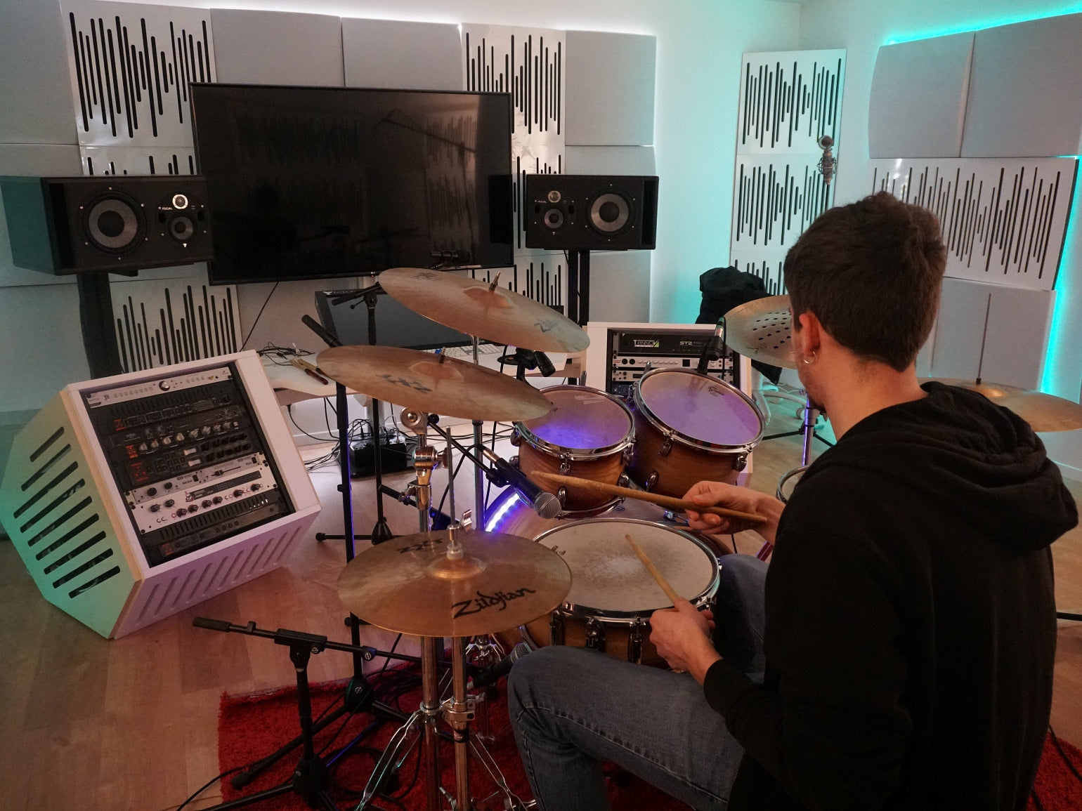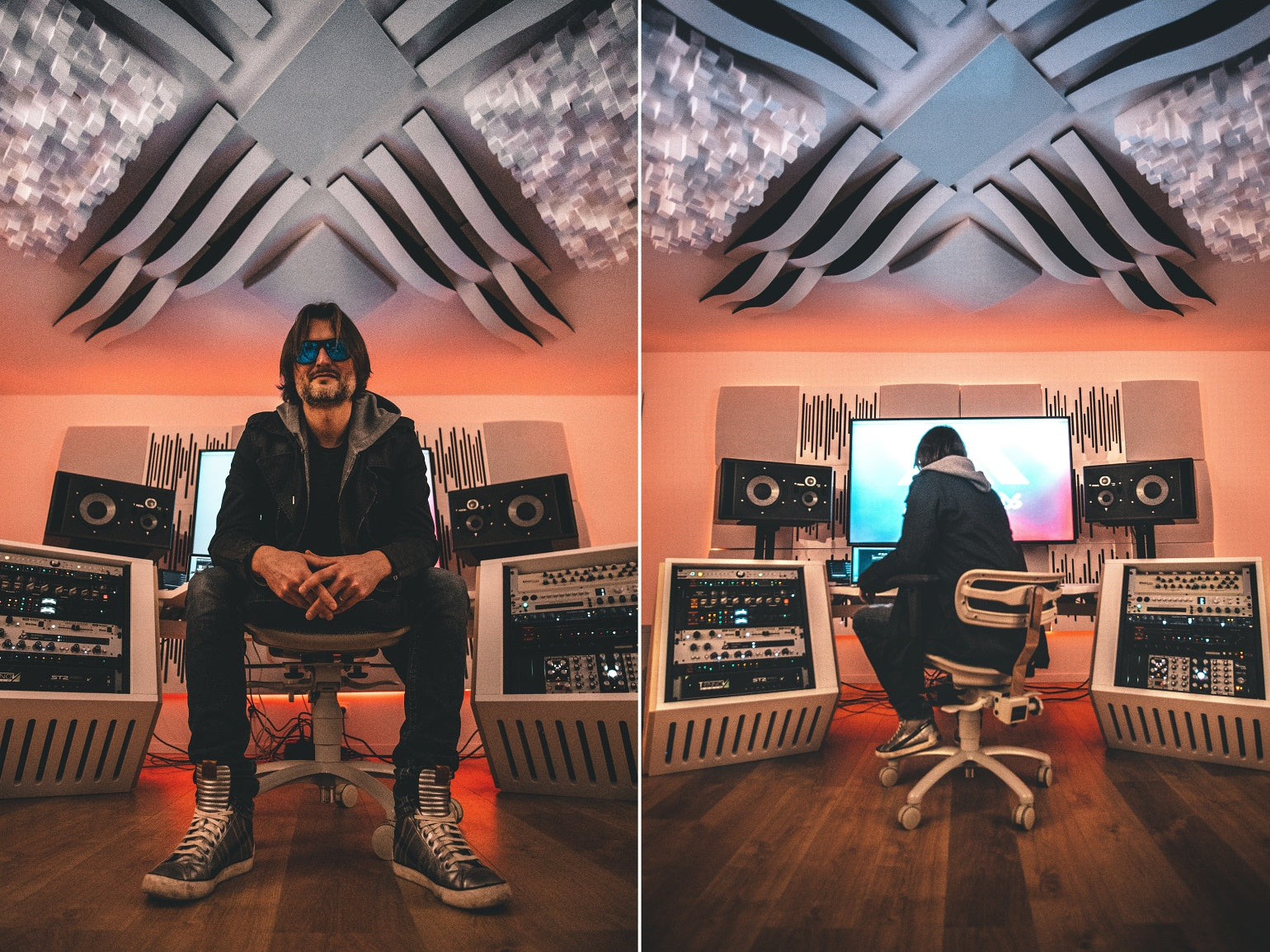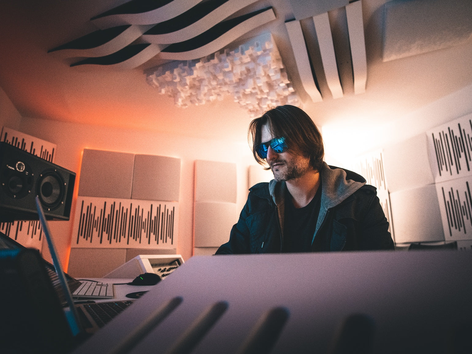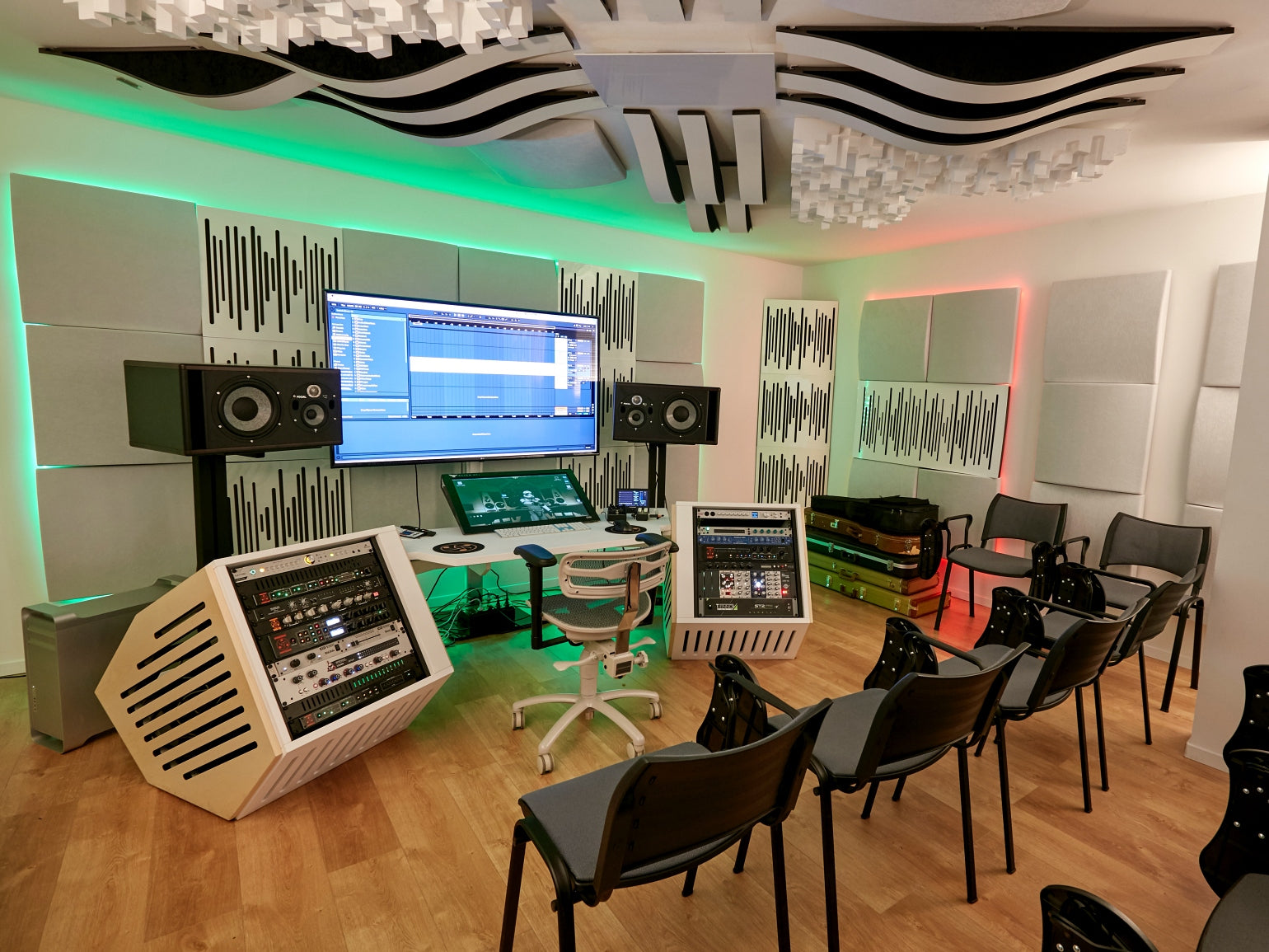 "There certainly is a 'wow factor' when you enter the room, and people are really inspired when they work in this atmosphere, like being in a futuristic spaceship! Right before putting the treatments on the wall we were playing with the incredibly bad flutter echo and huge reverb of the room; after treatment, perfection! Everything was on point", says Artsy Moods. The best part is that "the room isn’t dead sounding; it’s controlled and feels comfortable, not at all unnatural sounding".