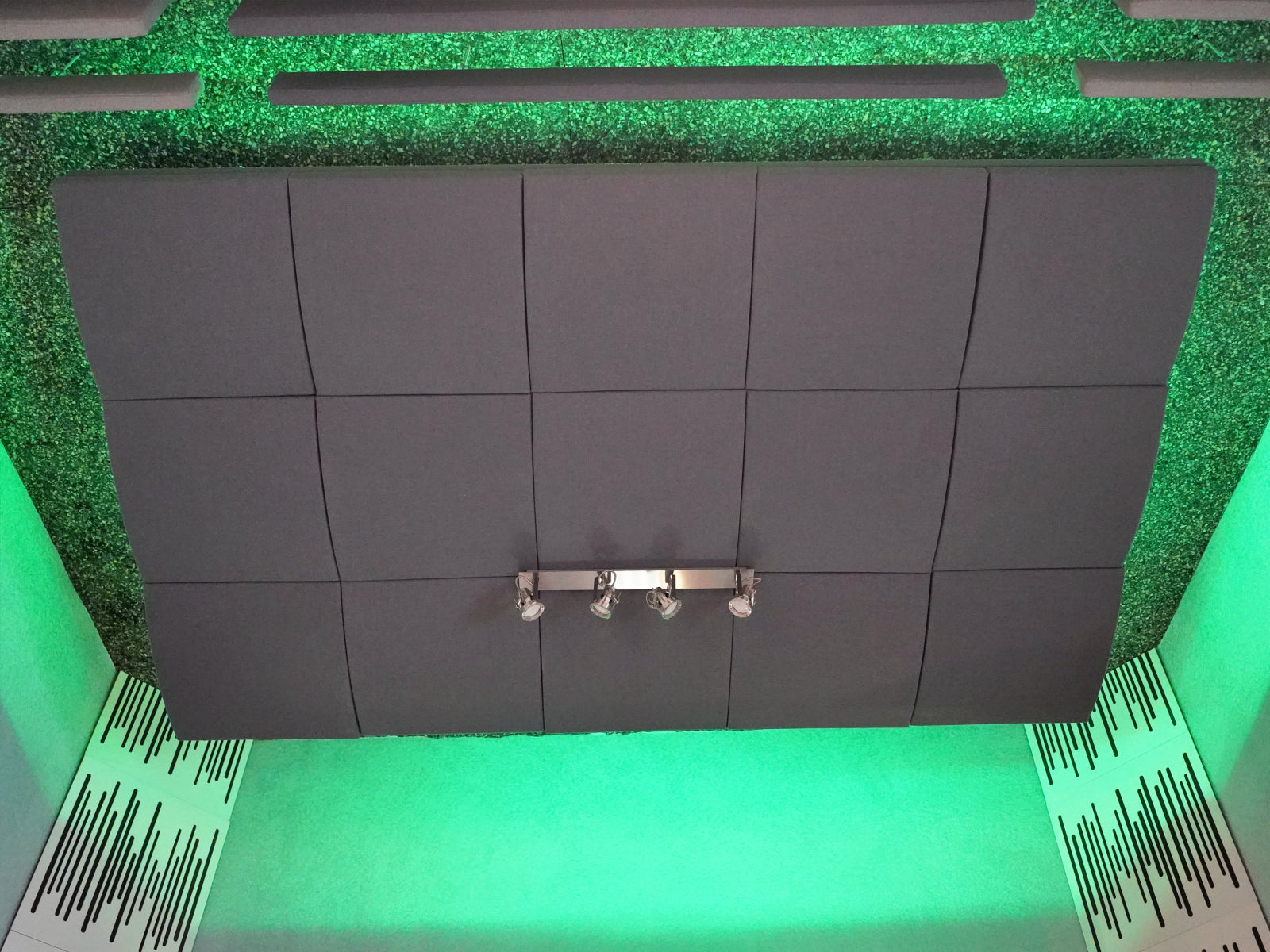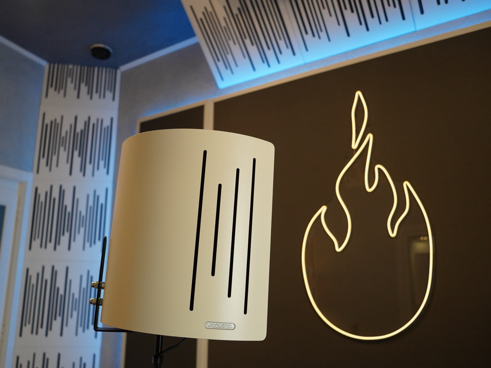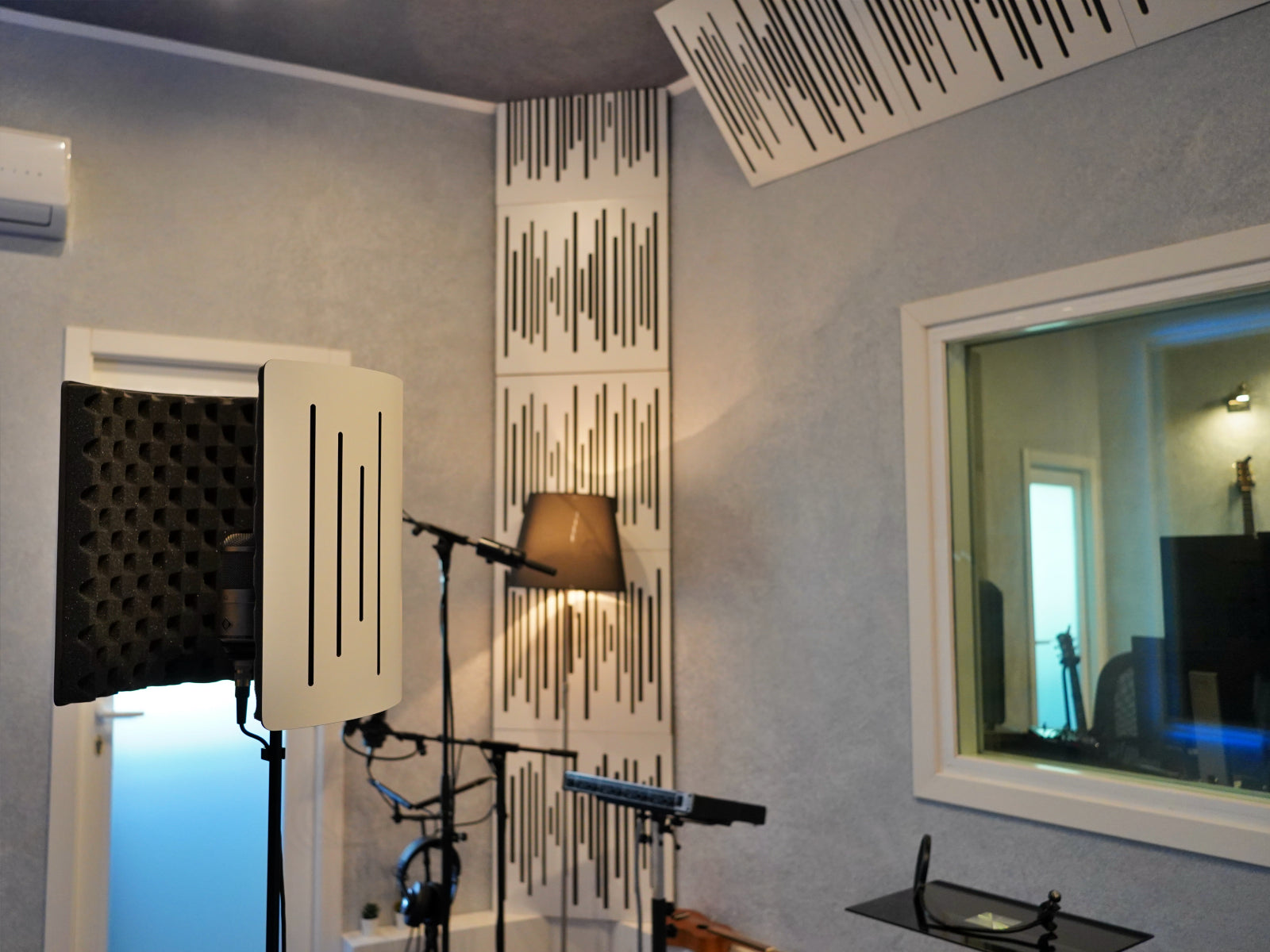A suspended solution with Cinema Round Premium was placed on the ceiling of the control room. The microphone isolation shield for voice recording Flexi Screen Ultra MKII has been the latest addition to the setup.