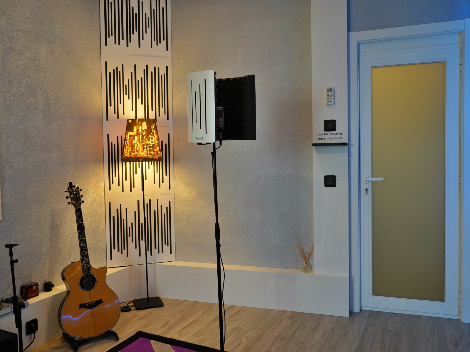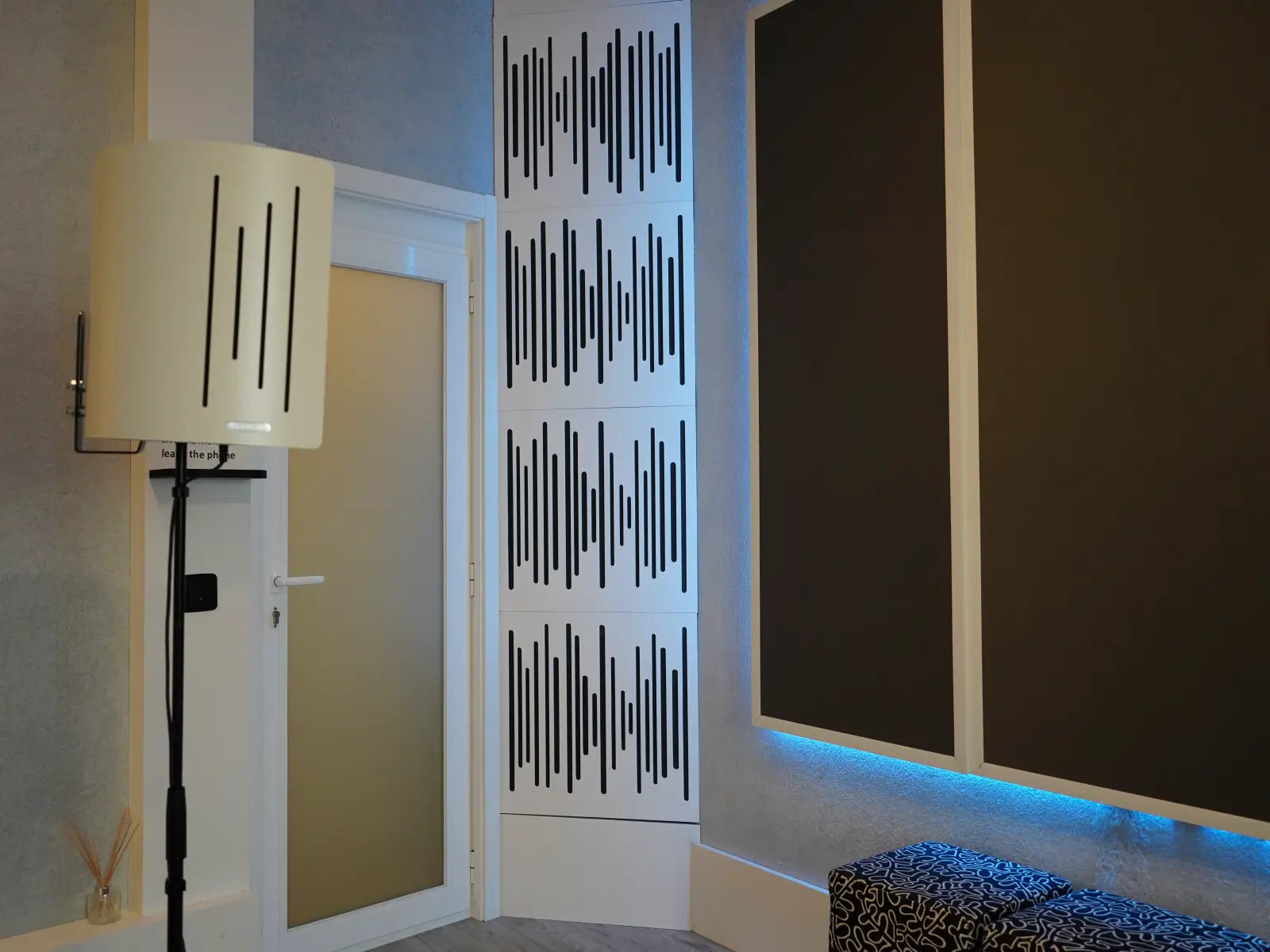 Throughout the years, Blim Records moved its studio's location several times and improved its conditions. From the beginning, the first choice for acoustic treatment was Vicoustic. The first foam acoustic panels are still in use, sometimes with new fabric coverings using the studio's brand signage, coexisting with Super Bass Extreme Ultra Wavewood used in corners and ceilings.