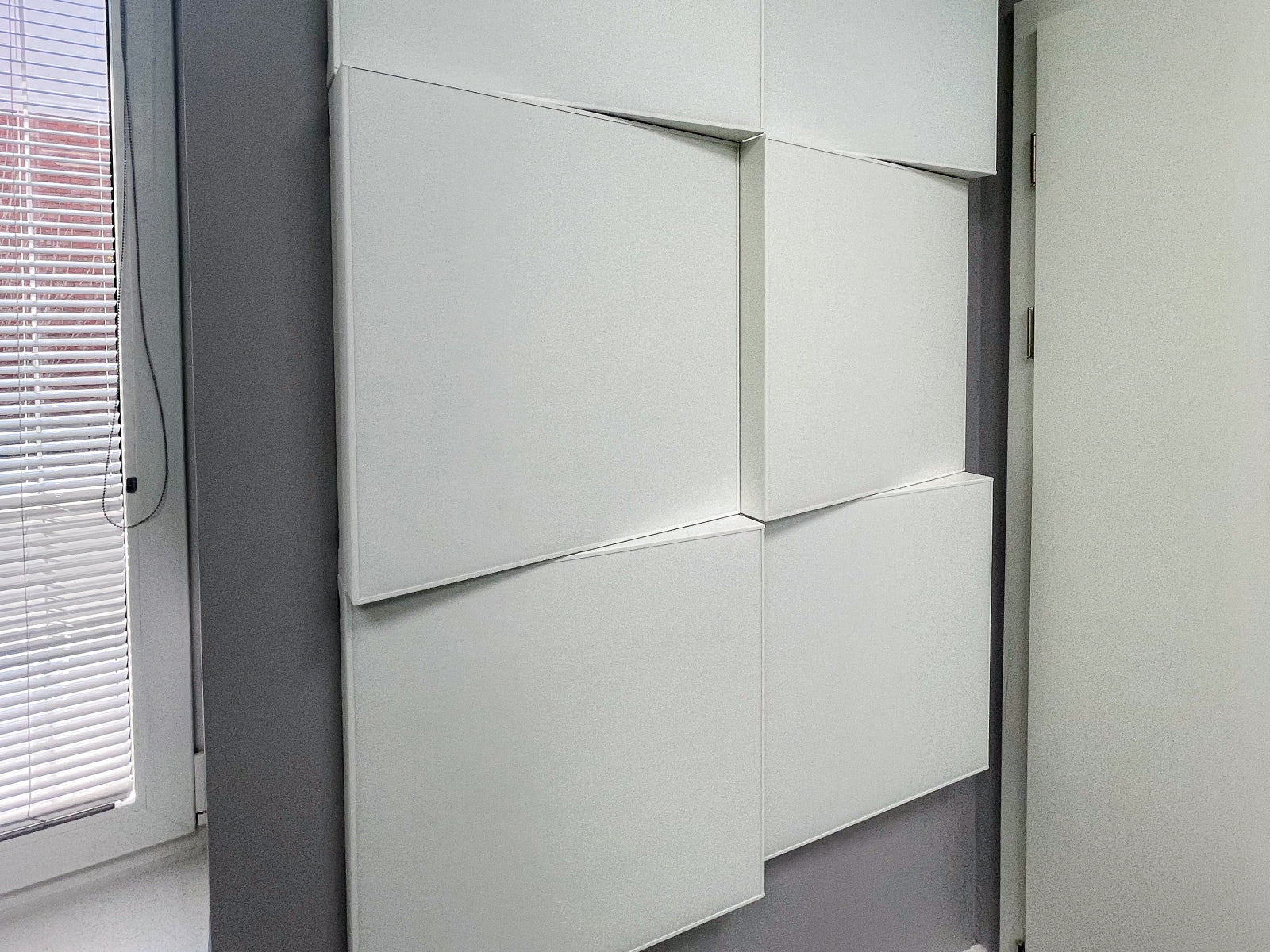 In the general studio, the team installed Flat Panel VMT acoustic panels in a thickness of 4 cm, which were also printed according to the specific color selected by the client. Cinema Forte VMT acoustic elements have been inserted into these panels, which not only take care of lower frequencies, but also create a nice 3D effect in the room.