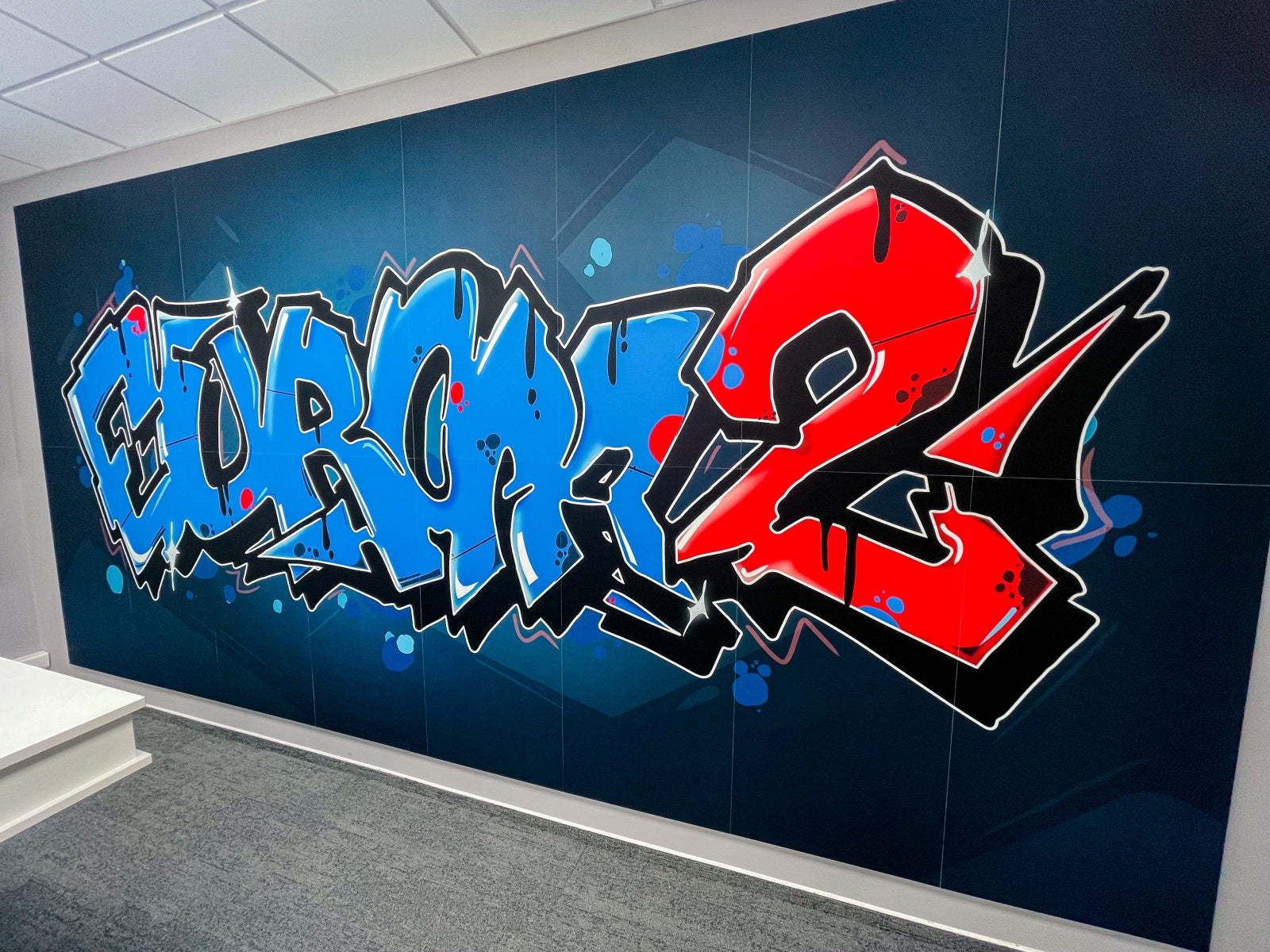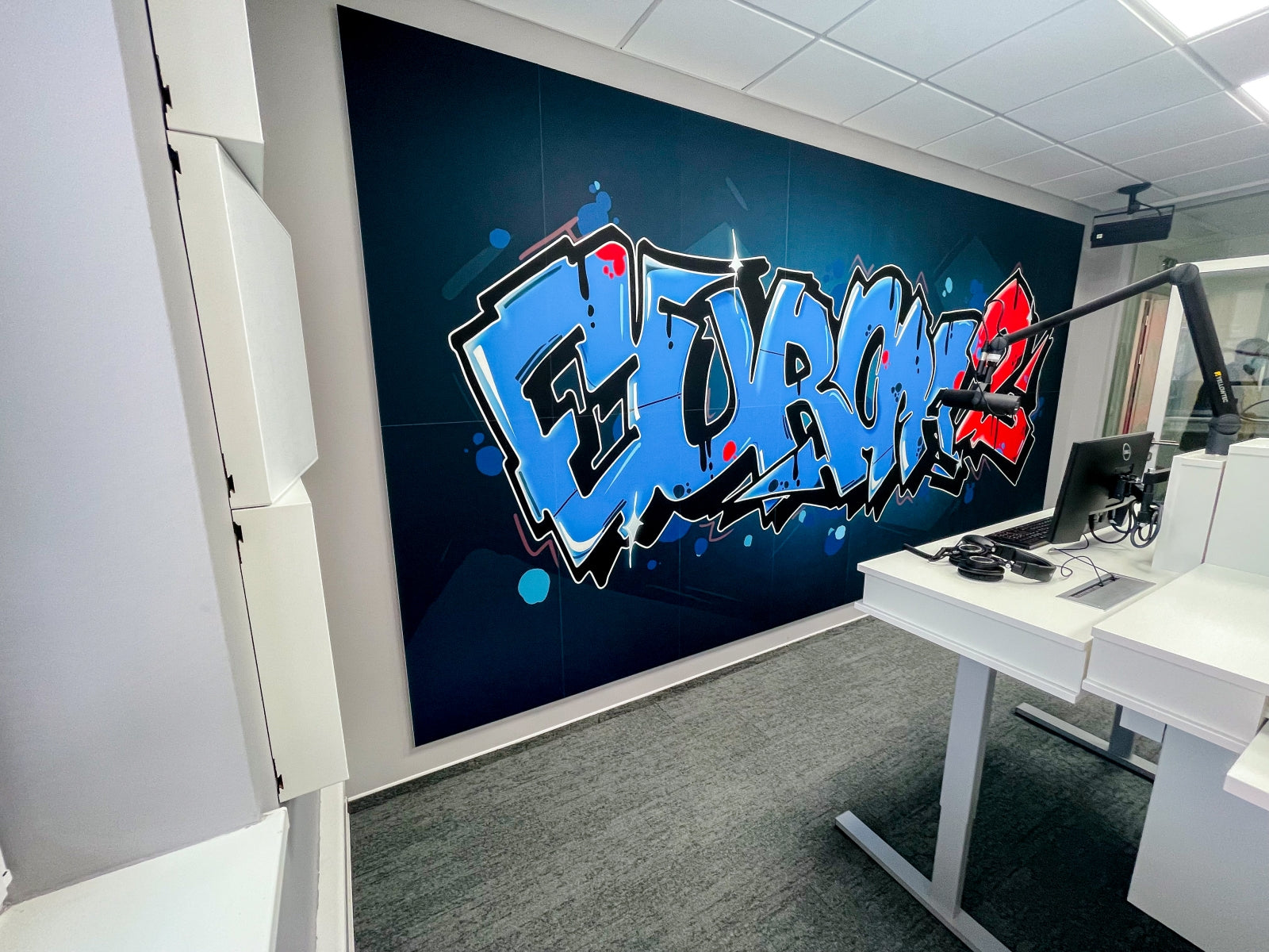 The Europa 2 studio has a large acoustic wall with the Europa 2 signage. The acoustic wall consists of 2cm thick Flat Panels VMT. The graphics on this wall are in modern graphite style and are custom-printed on the panels with Vicoustic's special technology so that their acoustic characteristics are preserved.