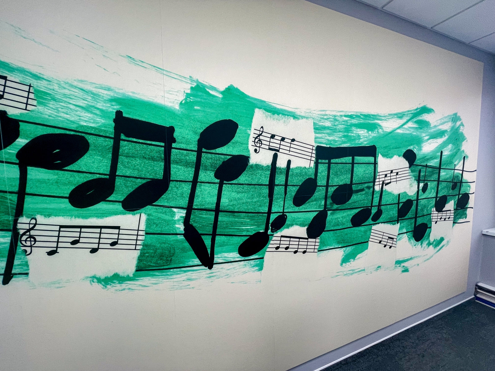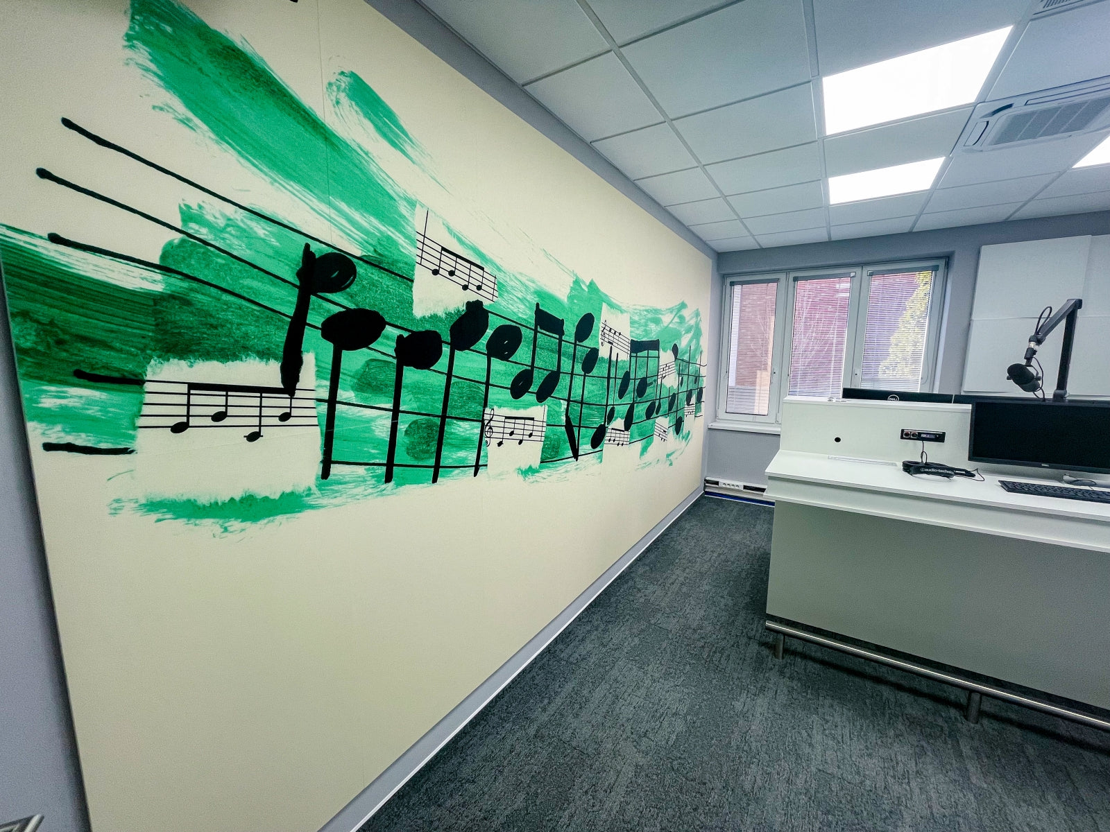 The Melody studio is dominated by a large acoustic wall, which consists of Vicoustic Flat Panel VMT, custom-designed with the client's own note graphics, which capture and represent the studio. On the opposite wall there is also a type of Flat Panel VMT in white color. There are also Cinema Forte VMT acoustic panels in the room, and a free-standing VicTotem Ultra VMT, which can be moved and rotated as needed to adjust the acoustic properties of the room.