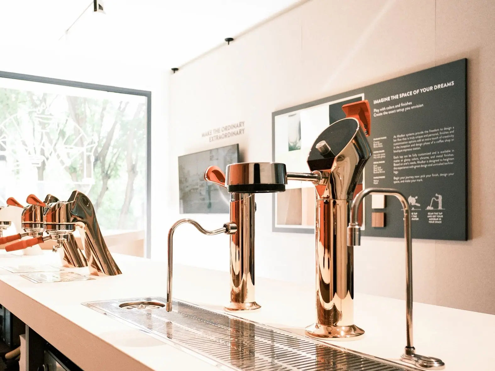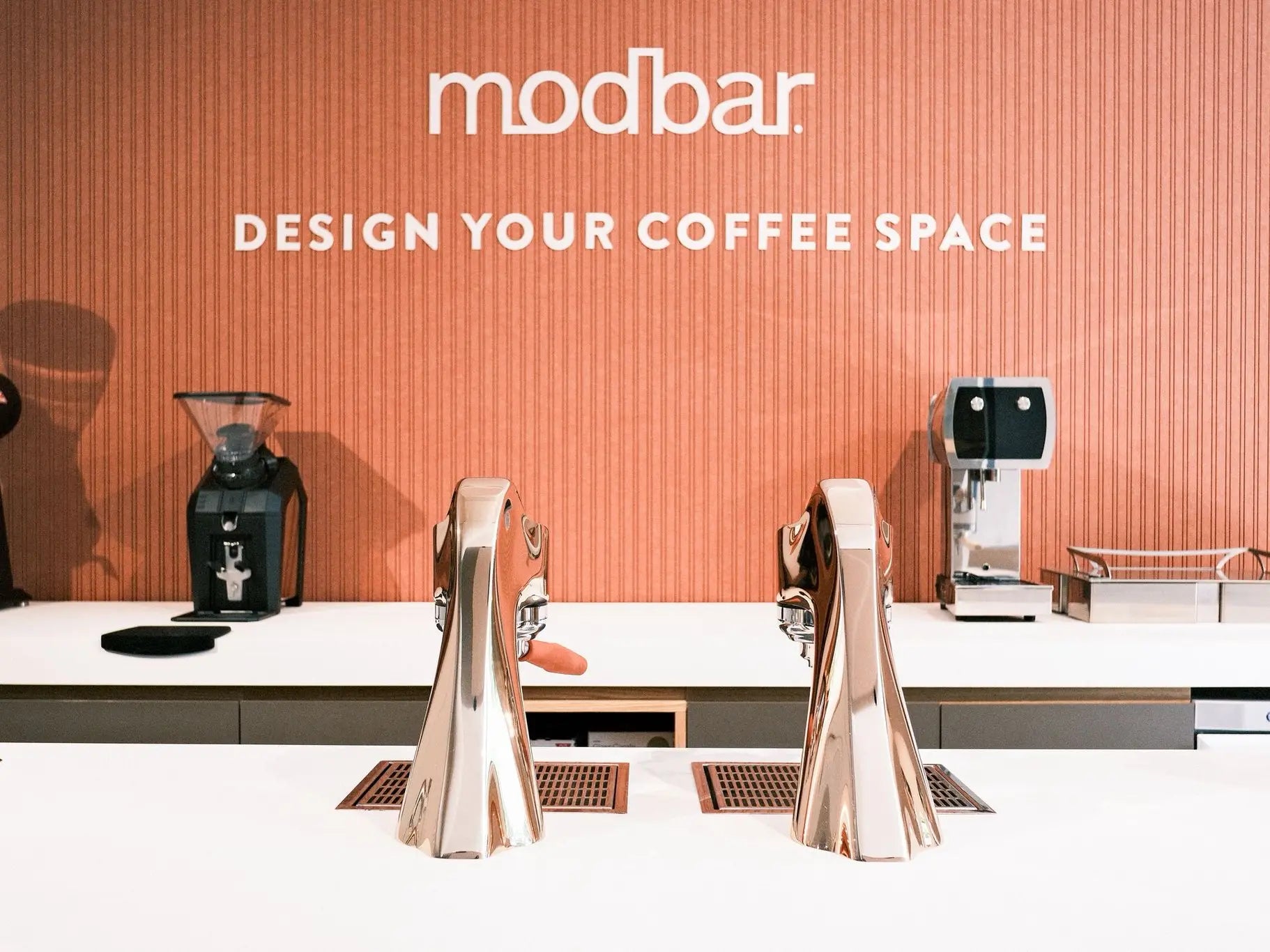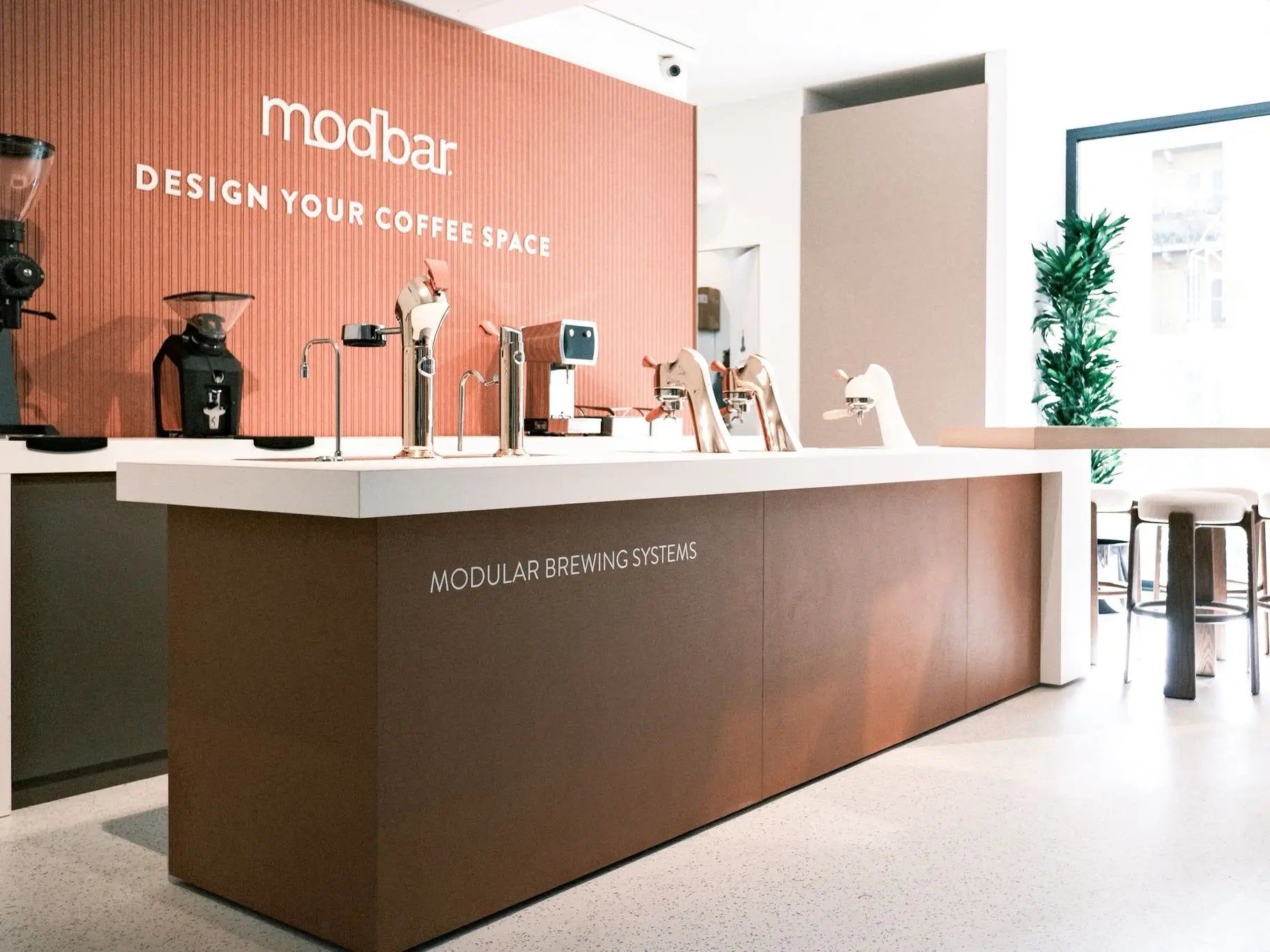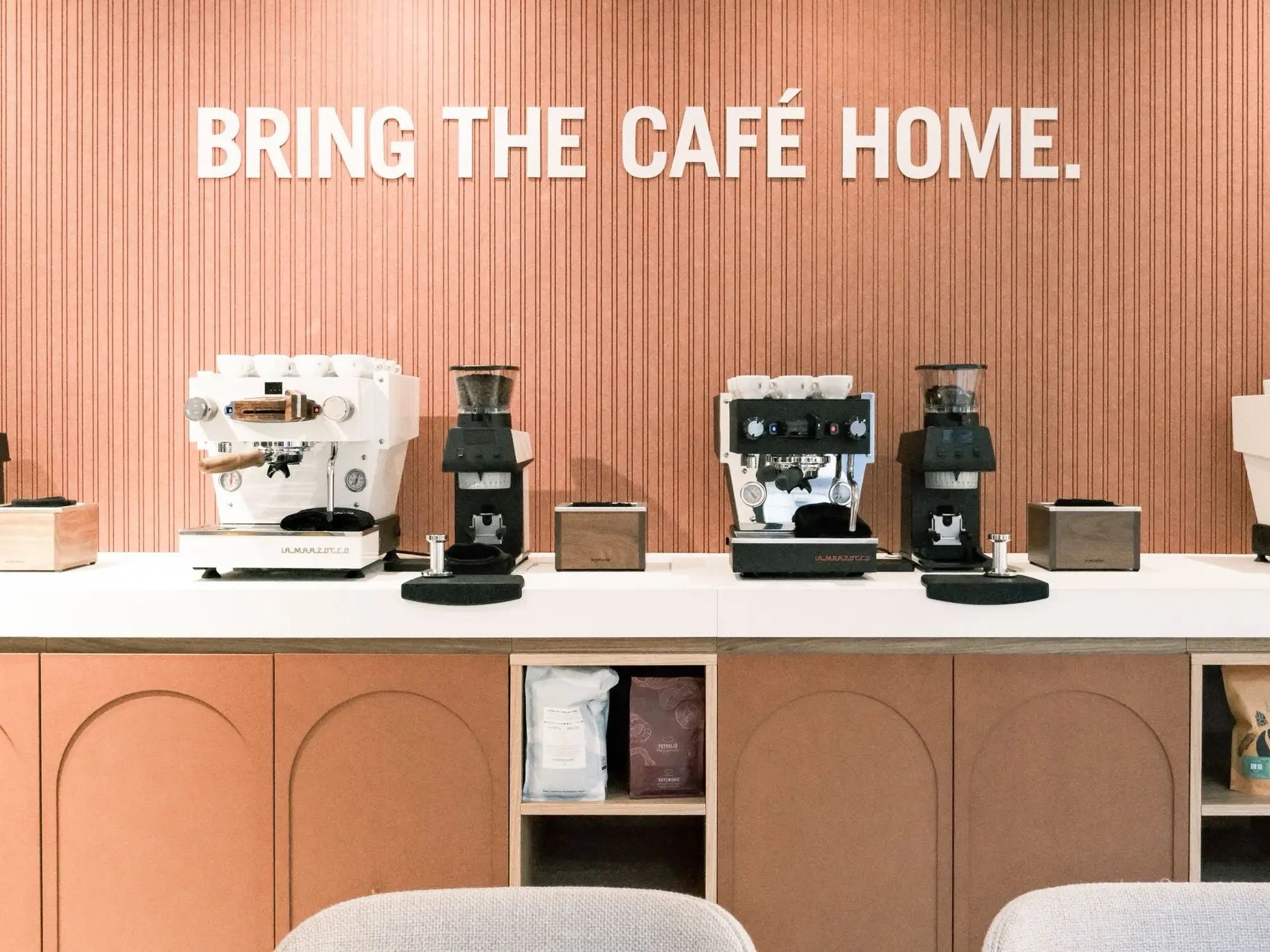 The brief for La Marzocco Milano was to make acoustic performance disappear into the architecture. The treatment had to match the store's terracotta-and-copper palette, read as a deliberate material choice rather than an acoustic add-on, and control reverberation across the full public area, from the Modbar counter to the home-machine showroom and the tasting table.