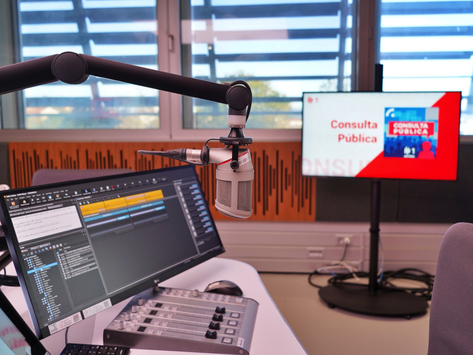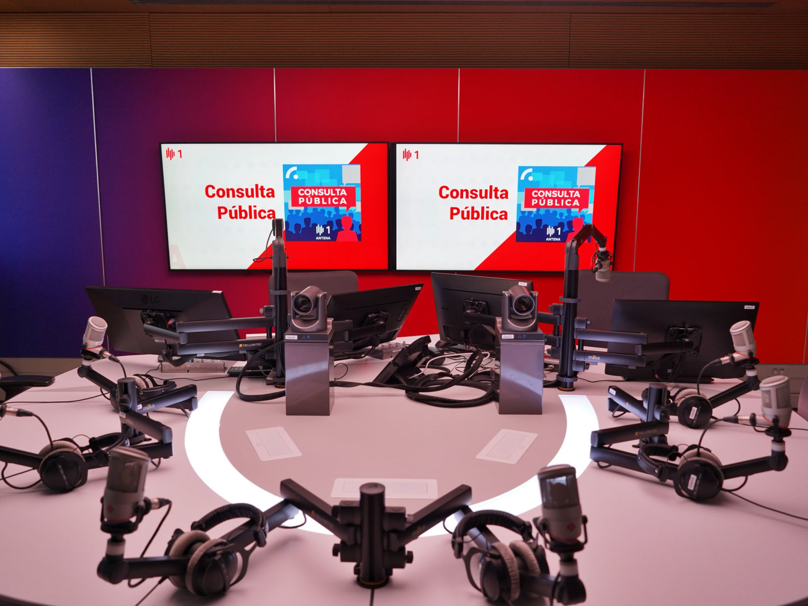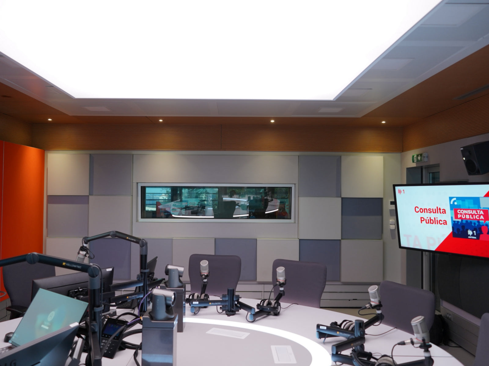 Studio 4 at Antena1 RTP radio station is a state-of-the-art broadcasting space that seamlessly combines aesthetics with acoustics to create an optimal environment for radio production, using sustainable sound absorbers.
