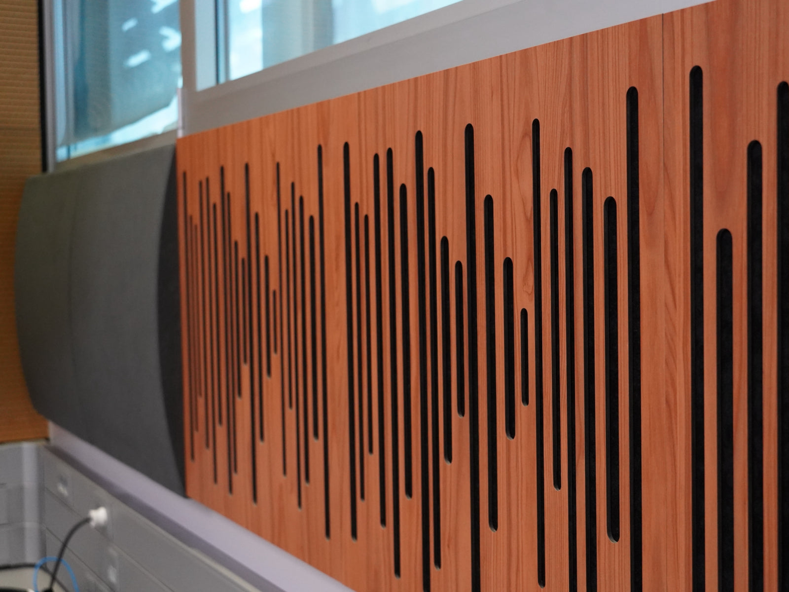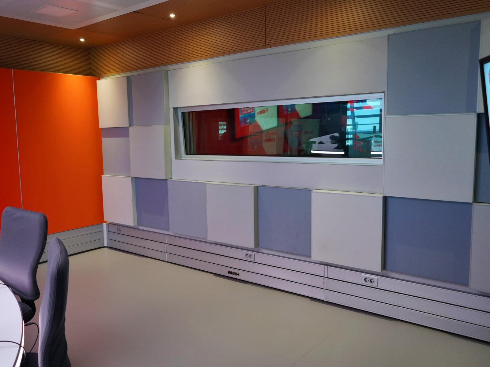 To enhance sound quality, the studio incorporates another wall with the Cinema VMT line of square sound-absorbers Cinema Piano VMT and Cinema Fortissimo VMT. These acoustic panels are strategically placed to absorb sound reflections, minimizing echo and ensuring a clean audio recording environment. The use of Cinema VMT contributes to a balanced and immersive audio experience for both radio hosts and listeners while using the VMT sustainable solution.