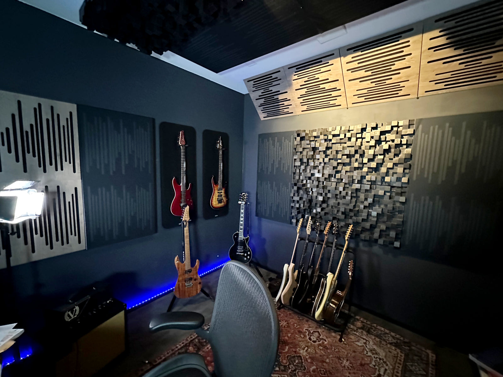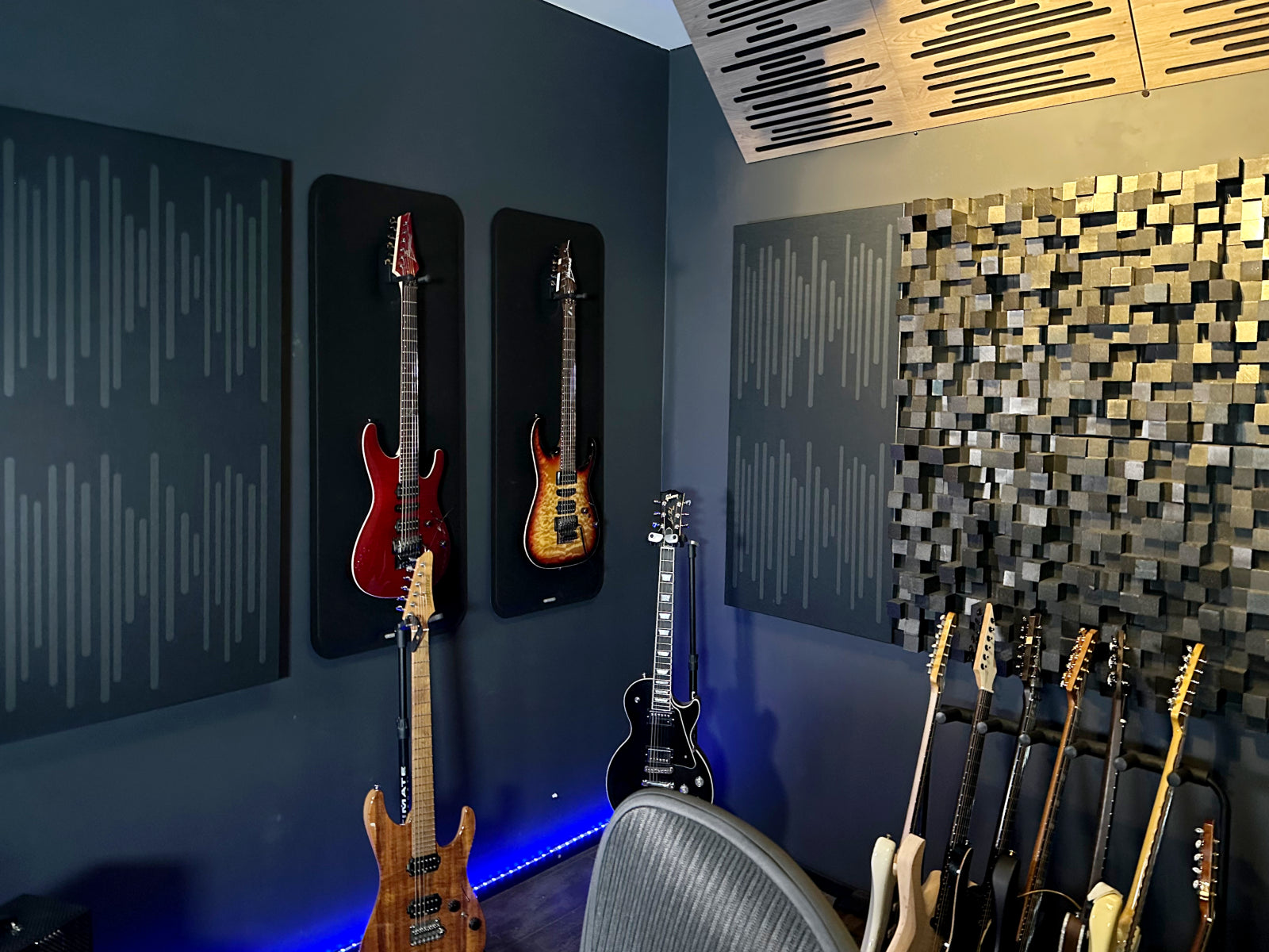 The ambiance is dark when you step into the control room, with acoustic panels furnishing the walls and sound diffusers in the ceiling, all in dark tones. Light stands out from a large collection of guitars, some of them hang on the wall in acoustic panels drawn to support the instruments: the VicDisplay Guitar.