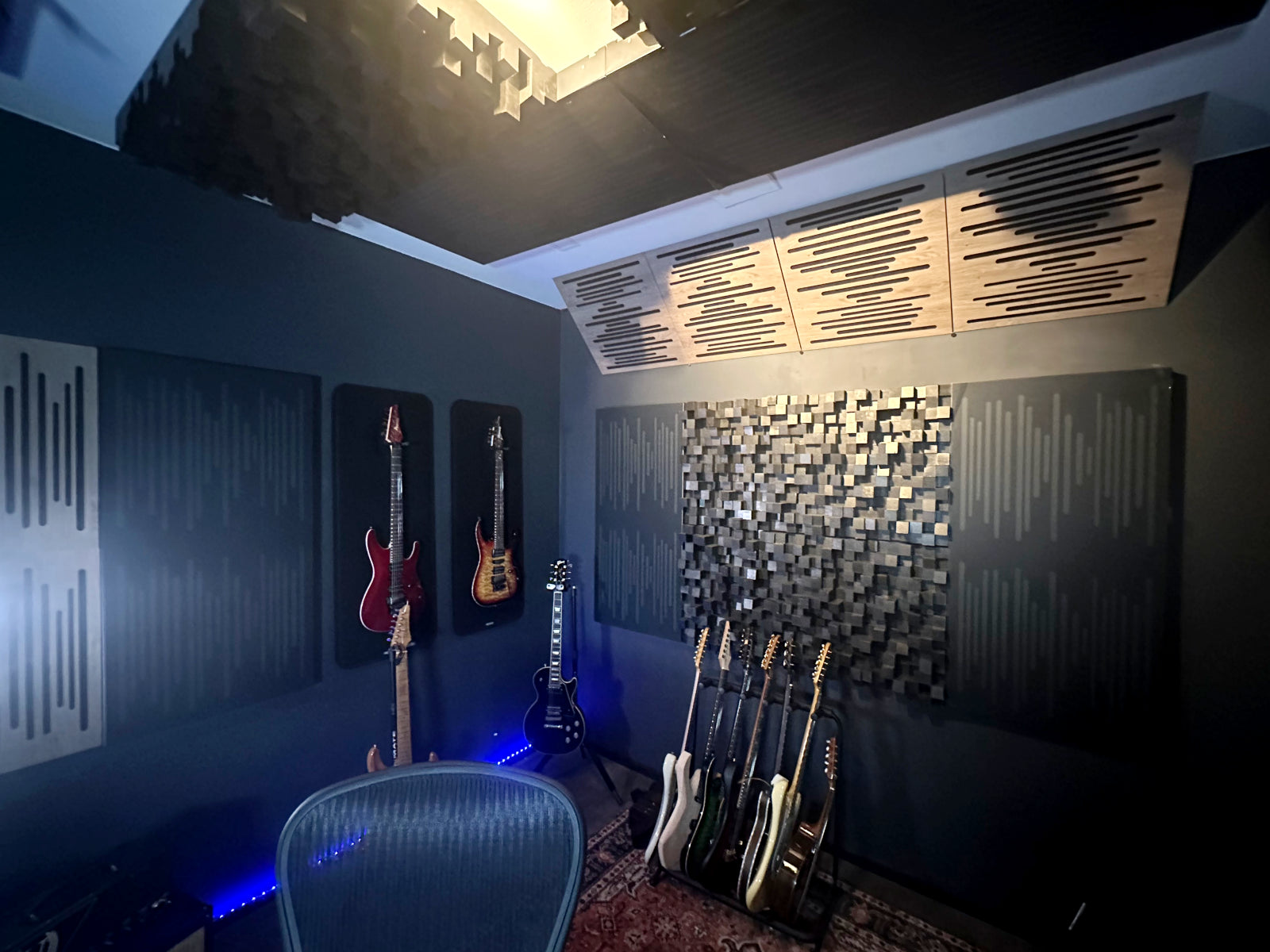 Since small spaces may result in room modes, Super Bass Extreme Ultra was recommended to act as a bass trap. It was installed in the corners of the ceiling to control low frequencies anomalies. The room's treatment is completed with VicPattern Ultra Wavewood.