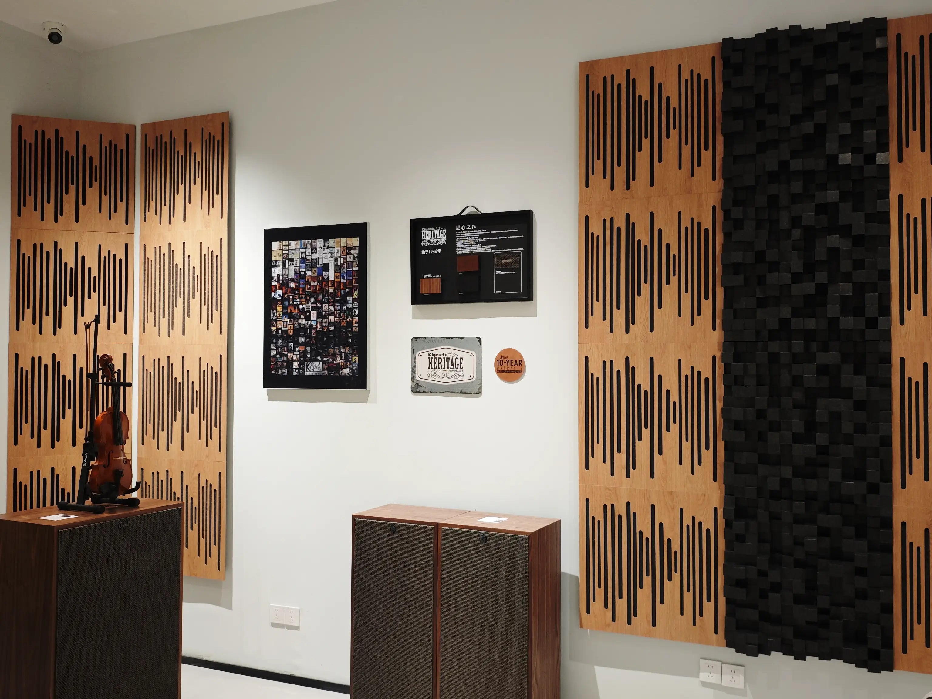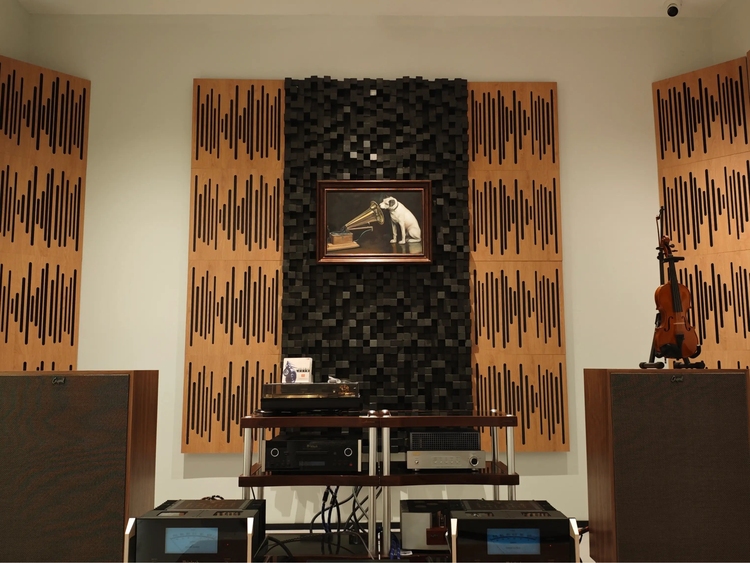 Wavewood Ultra Lite panels in Natural Oak act as a hybrid absorber and diffuser, controlling room energy and mid-range frequencies while adding organic warmth to the space. These are complemented by Multifuser DC3 in Black, which helps broaden the soundstage and eliminate flutter echoes to ensure every note remains crisp and defined.