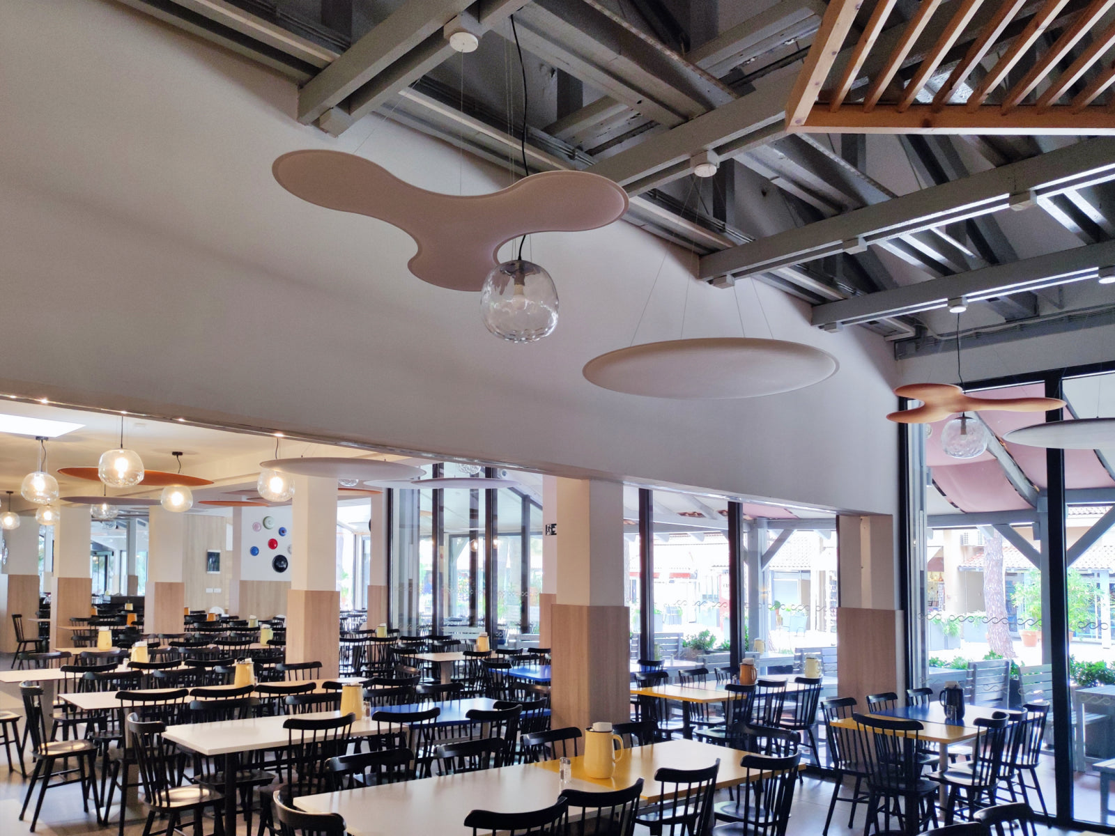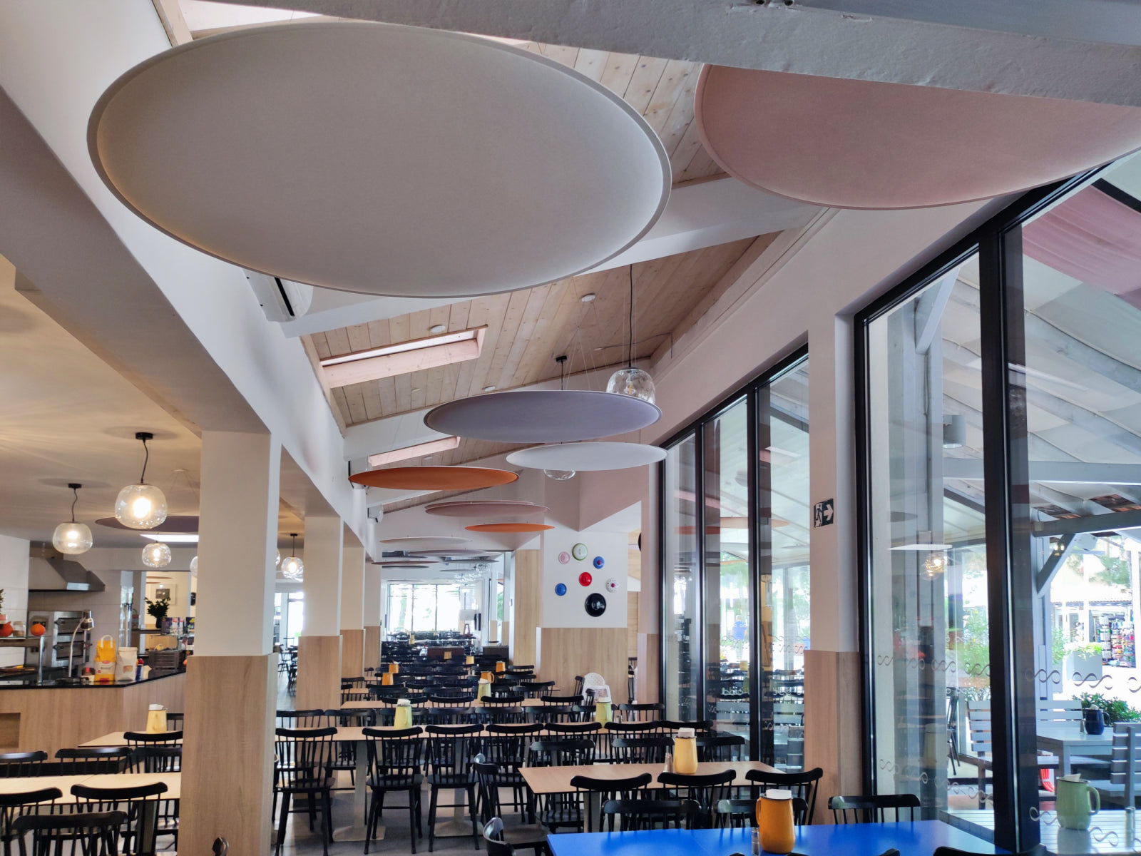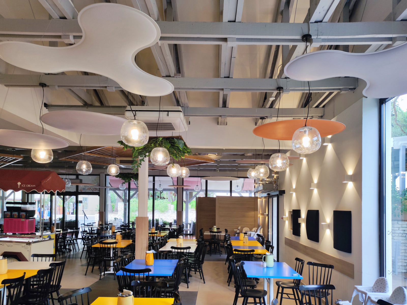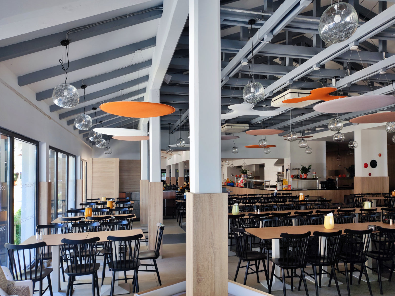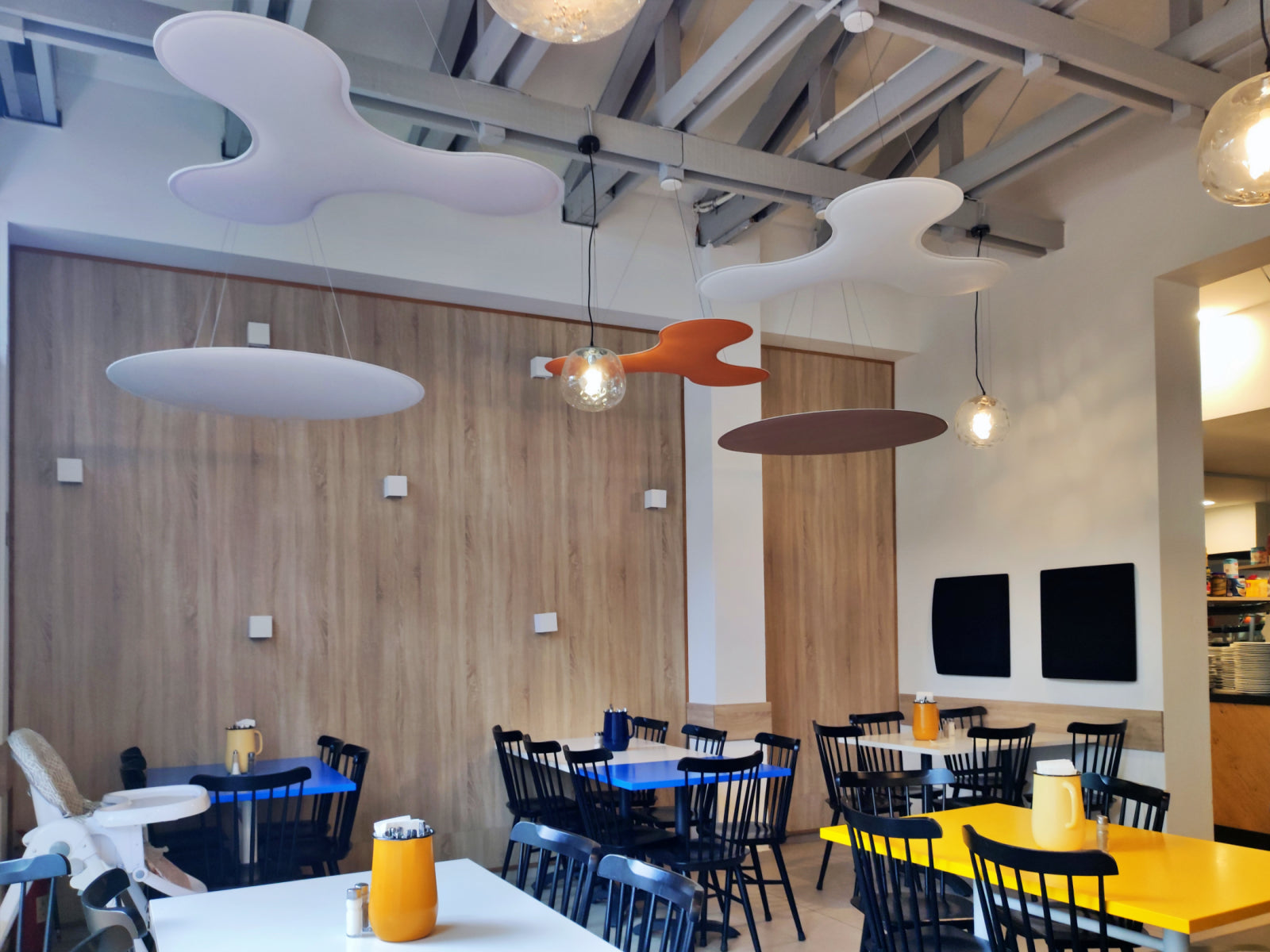 To tackle these challenges, Audion d.o.o. recommended cloud panels as the ideal solution, considering the restaurant’s high ceilings and the need for ease of installation. The ViCloud VMT 3D panels, shaped as petals and round circles, were distributed across 12 strategic points in the space. The clouds were installed in a variety of colors, including white, beige, light grey, and orange, creating a dynamic and vibrant visual effect.