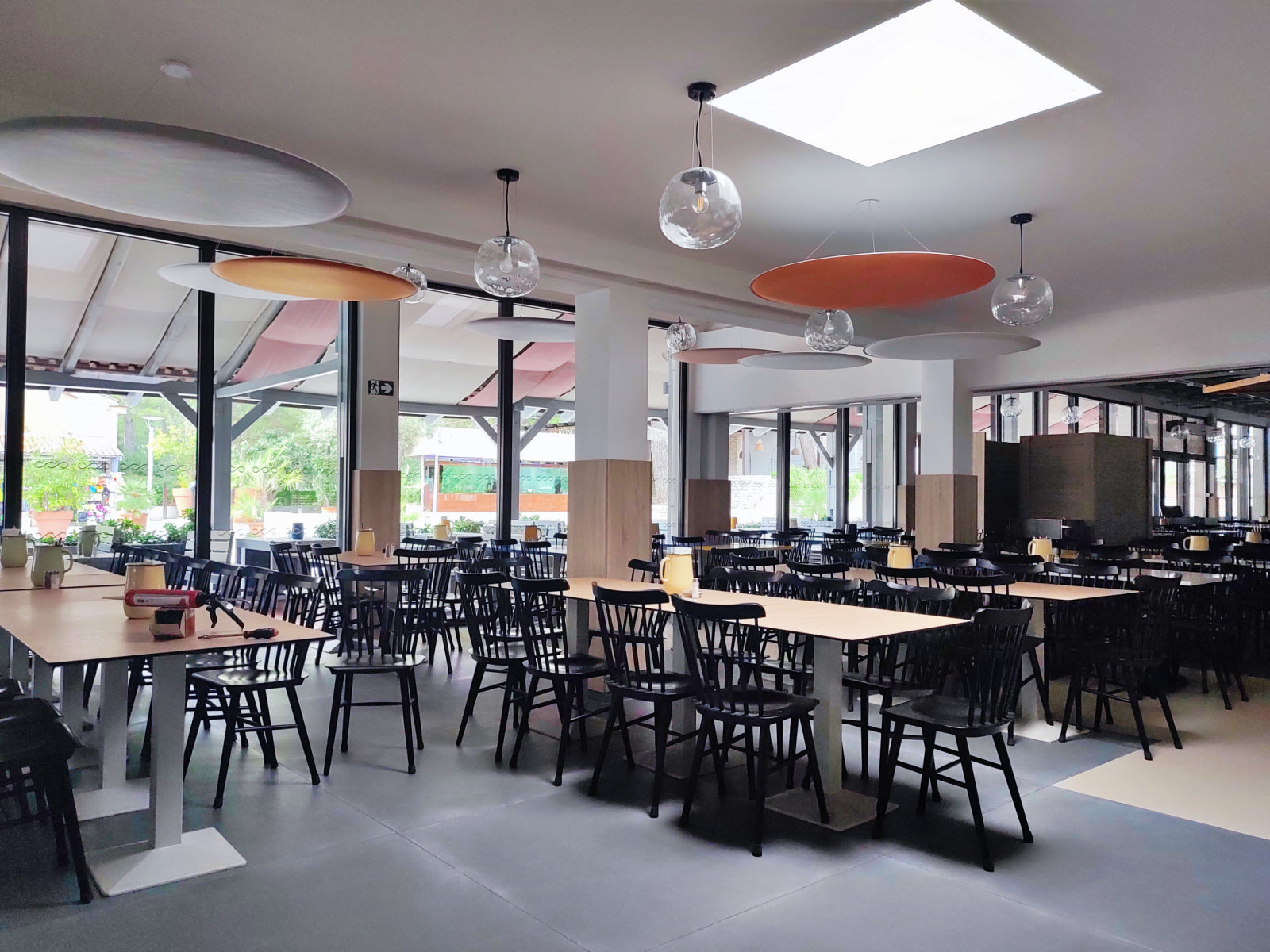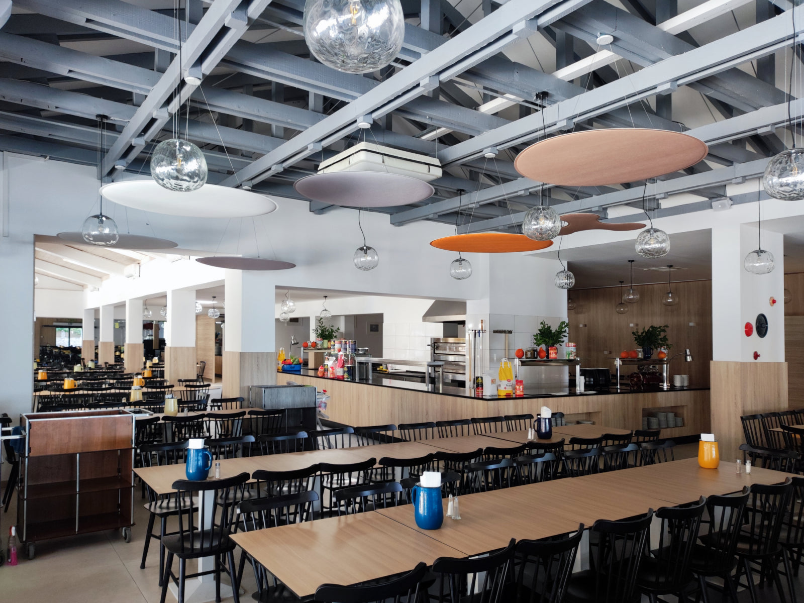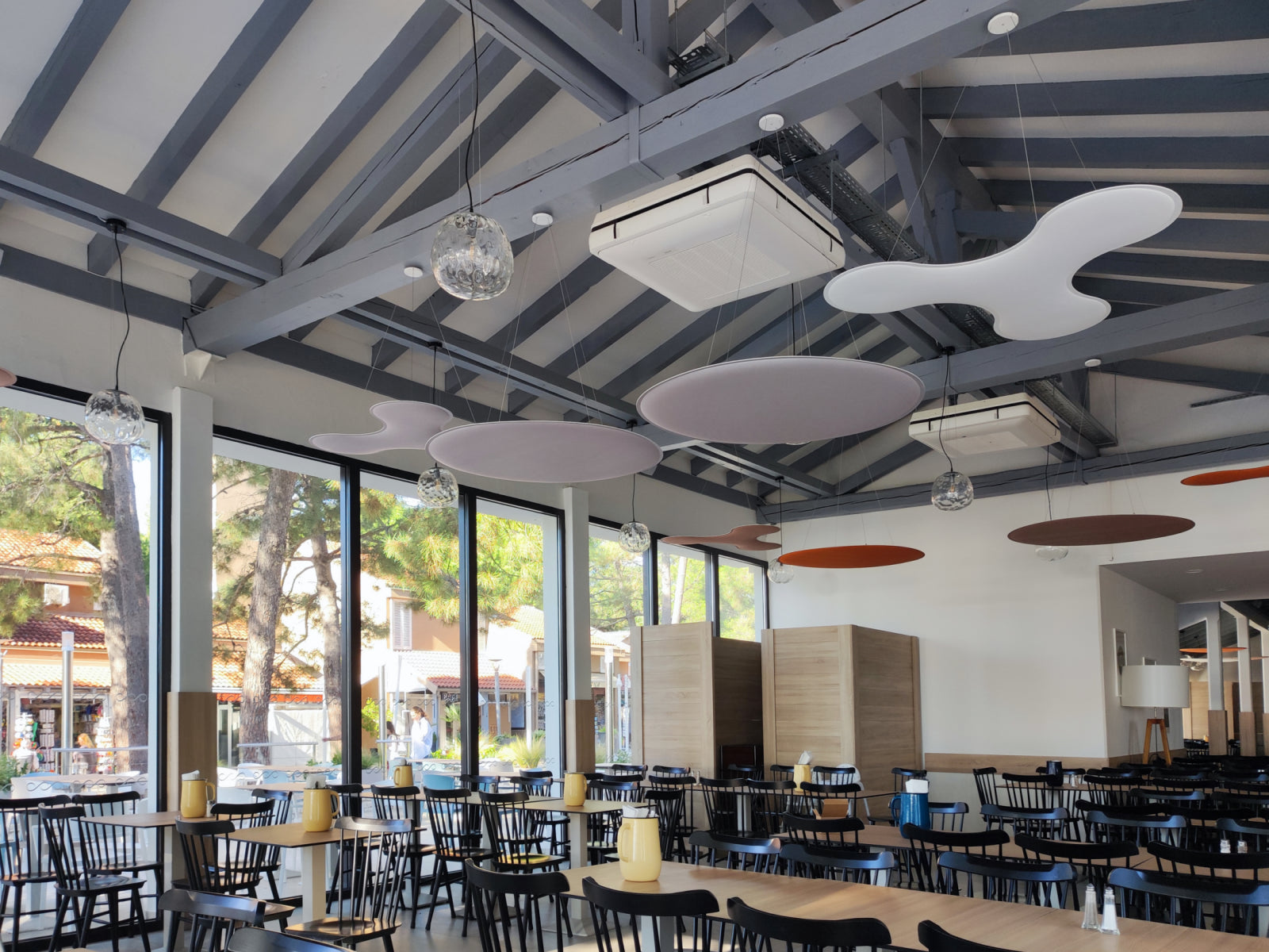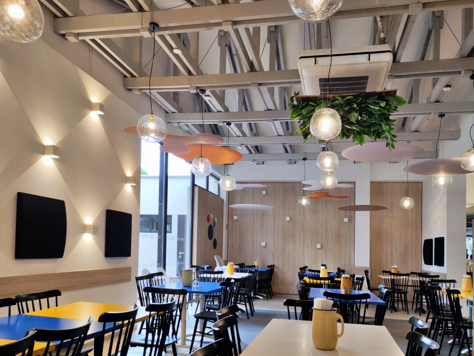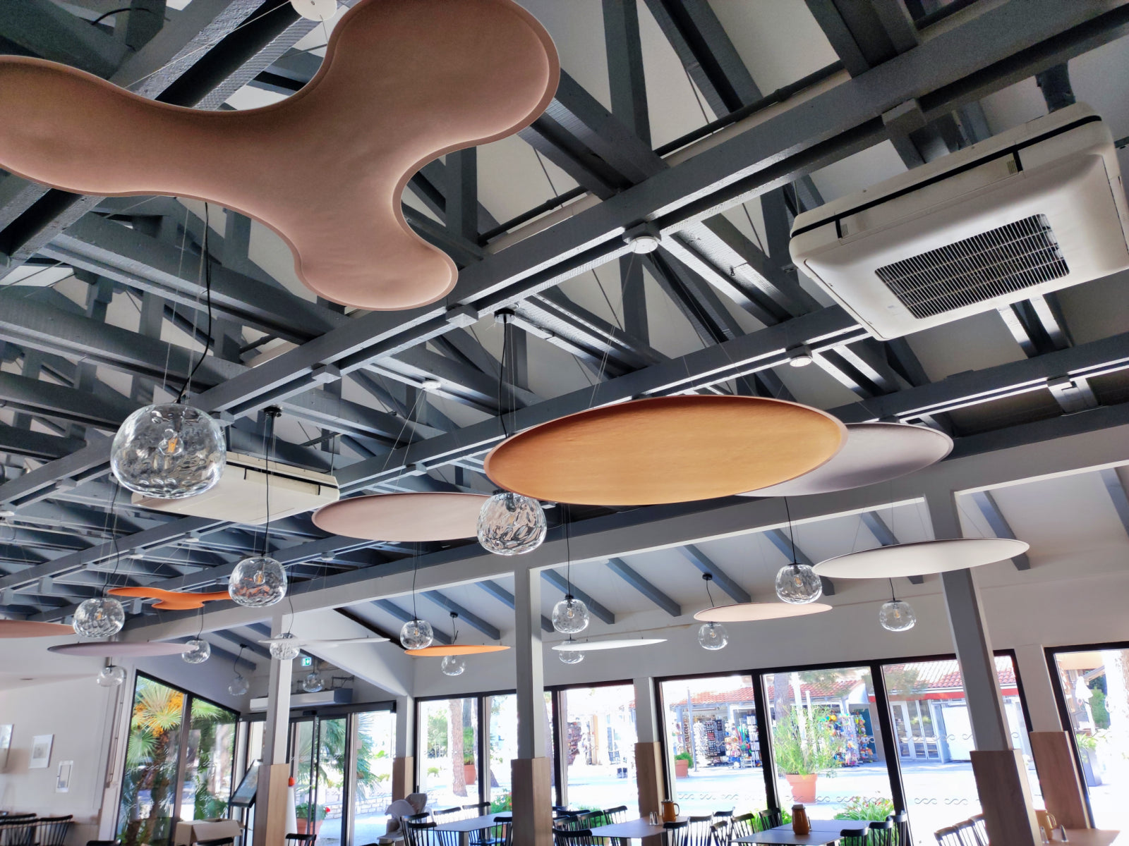 To tackle these challenges, Audion d.o.o. recommended cloud panels as the ideal solution, considering the restaurant’s high ceilings and the need for ease of installation. The ViCloud VMT 3D panels, shaped as petals and round circles, were distributed across 12 strategic points in the space. The clouds were installed in a variety of colors, including white, beige, light grey, and orange, creating a dynamic and vibrant visual effect.