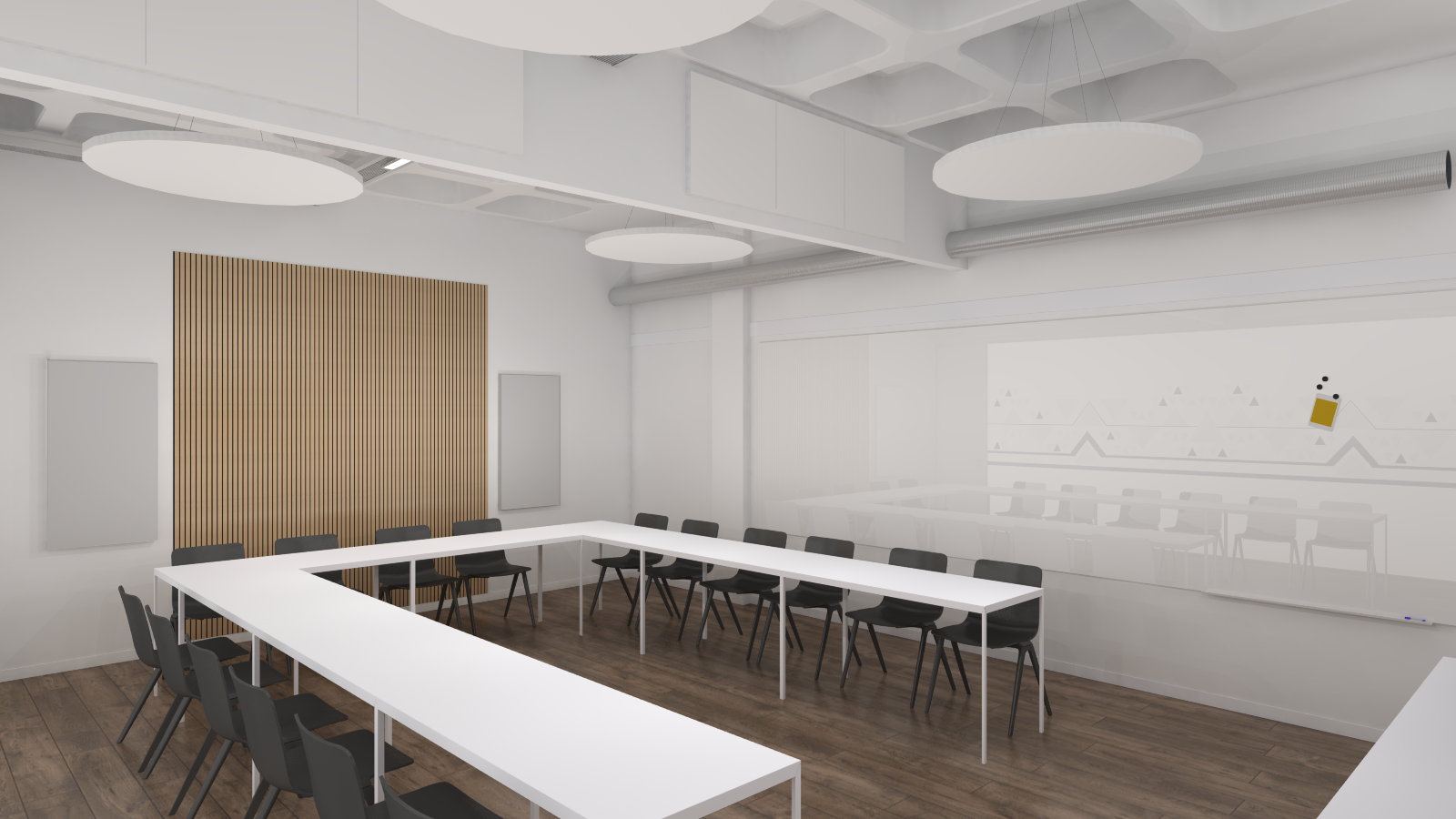 For the Management Meeting Room acoustic treatment, Vicoustic proposed Flat Panel VMT and VicStrip panels applied to the walls and ceiling to help control reverberation time within these rooms.