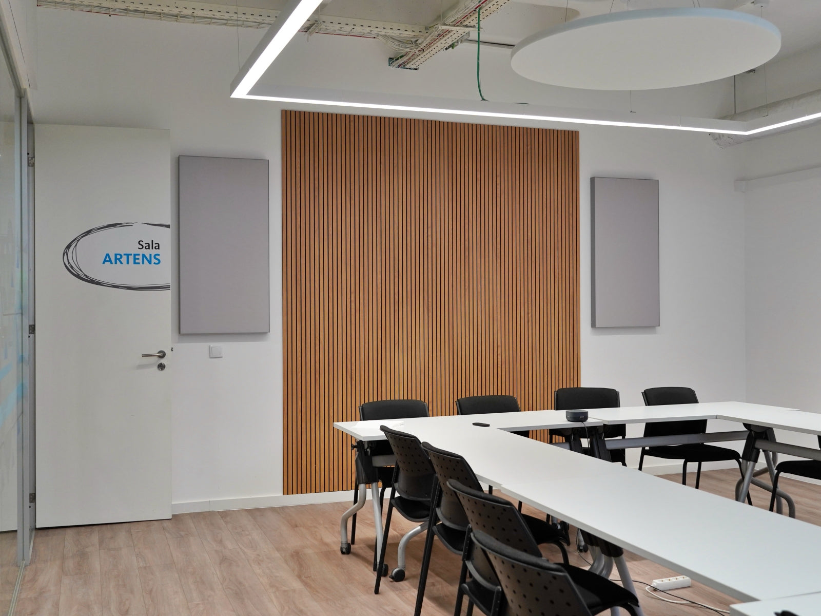 For the acoustic treatment of the Artens Meeting Room, Vicoustic proposed sound-absorbing elements that will control sound reflections. Flat Panel VMT with VicSpacer Plus and VicStrip were the solutions applied to the walls.