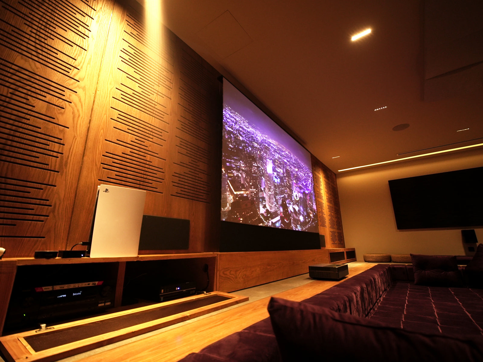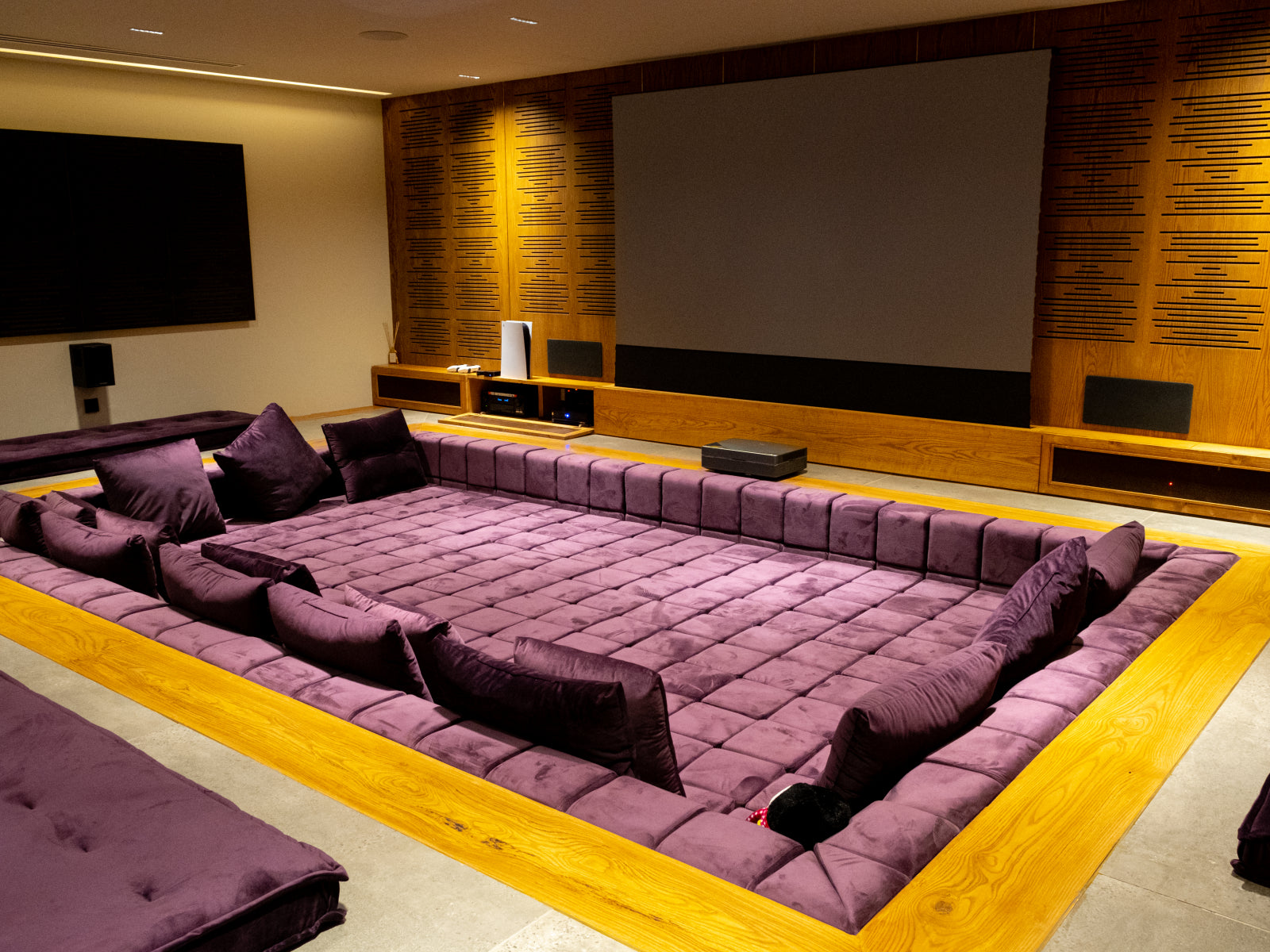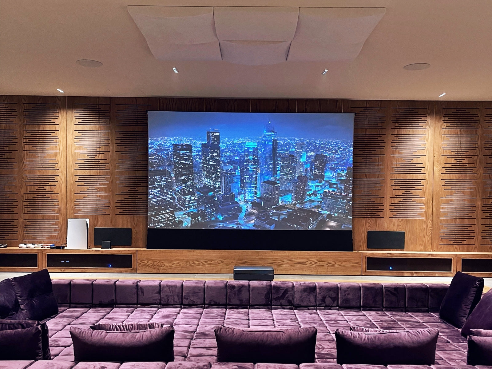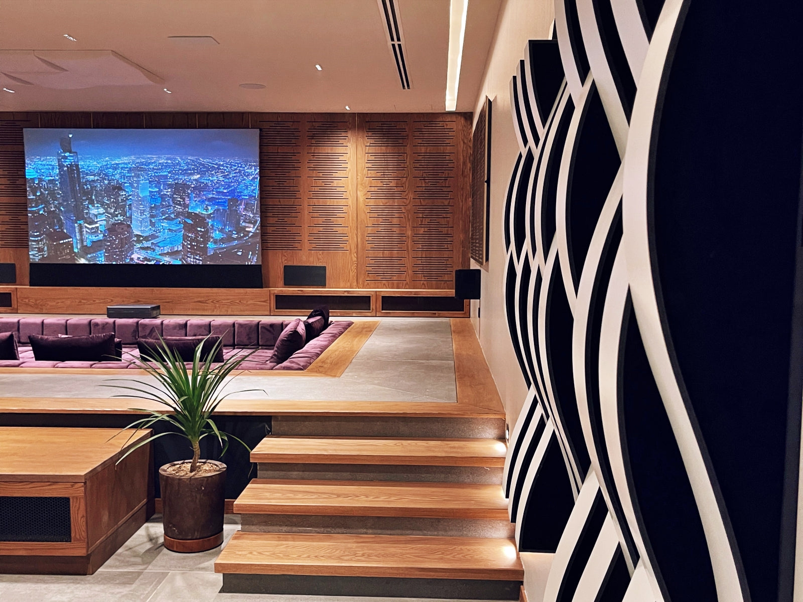 A combination of absorption and diffusion techniques was employed to achieve the desired acoustic balance and optimal ‘cinematic experience’. Absorption panels were strategically placed to absorb excess sound energy and minimize reflections, while diffusers were used to scatter and disperse sound waves, ensuring a more even distribution of sound throughout the space. First reflections are treated by the application of proportionate absorption panels on the left, right and ceiling of the seating area.