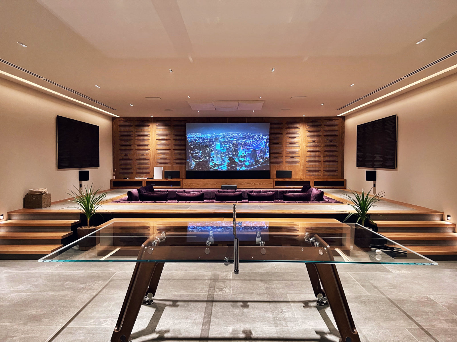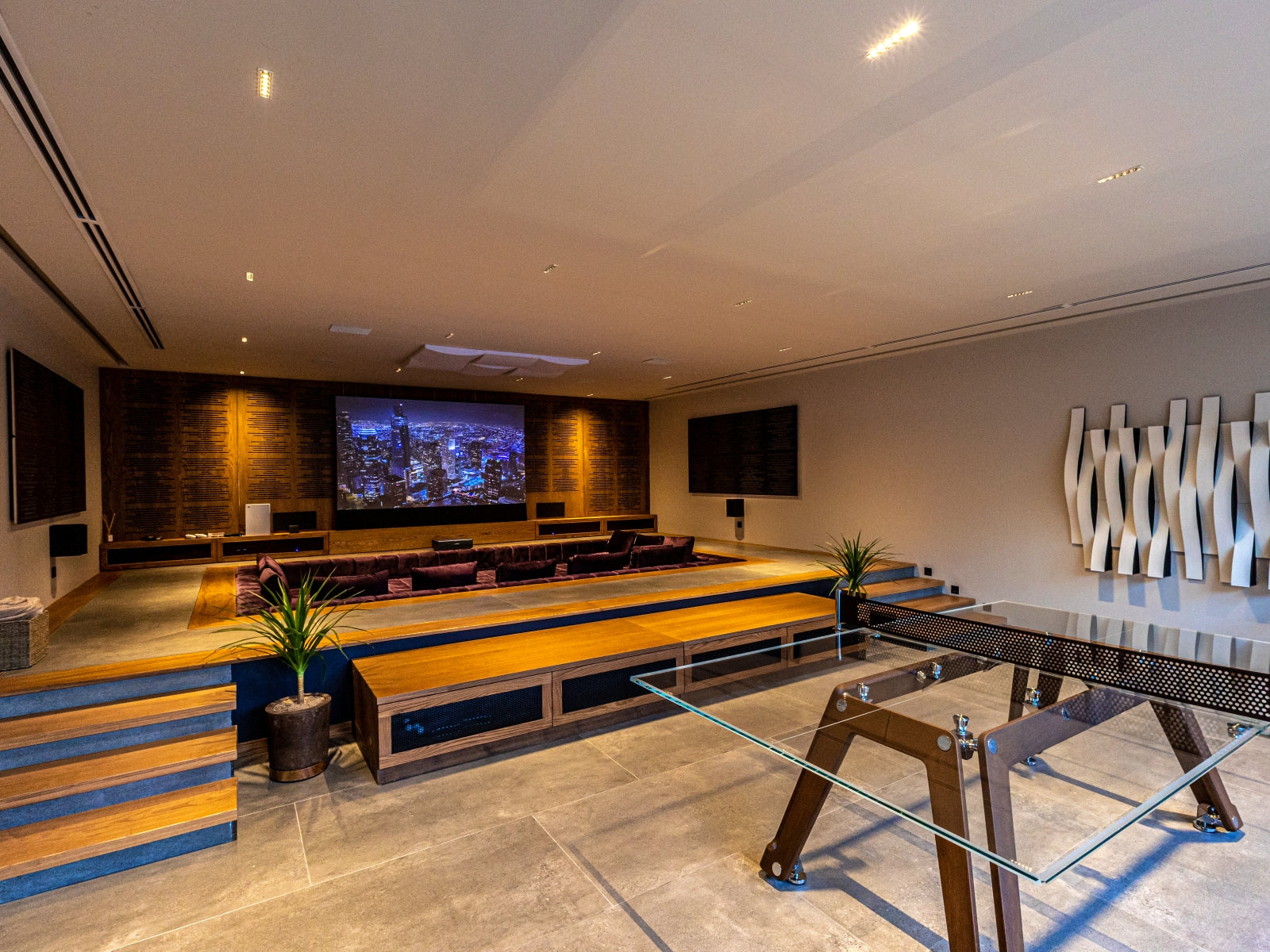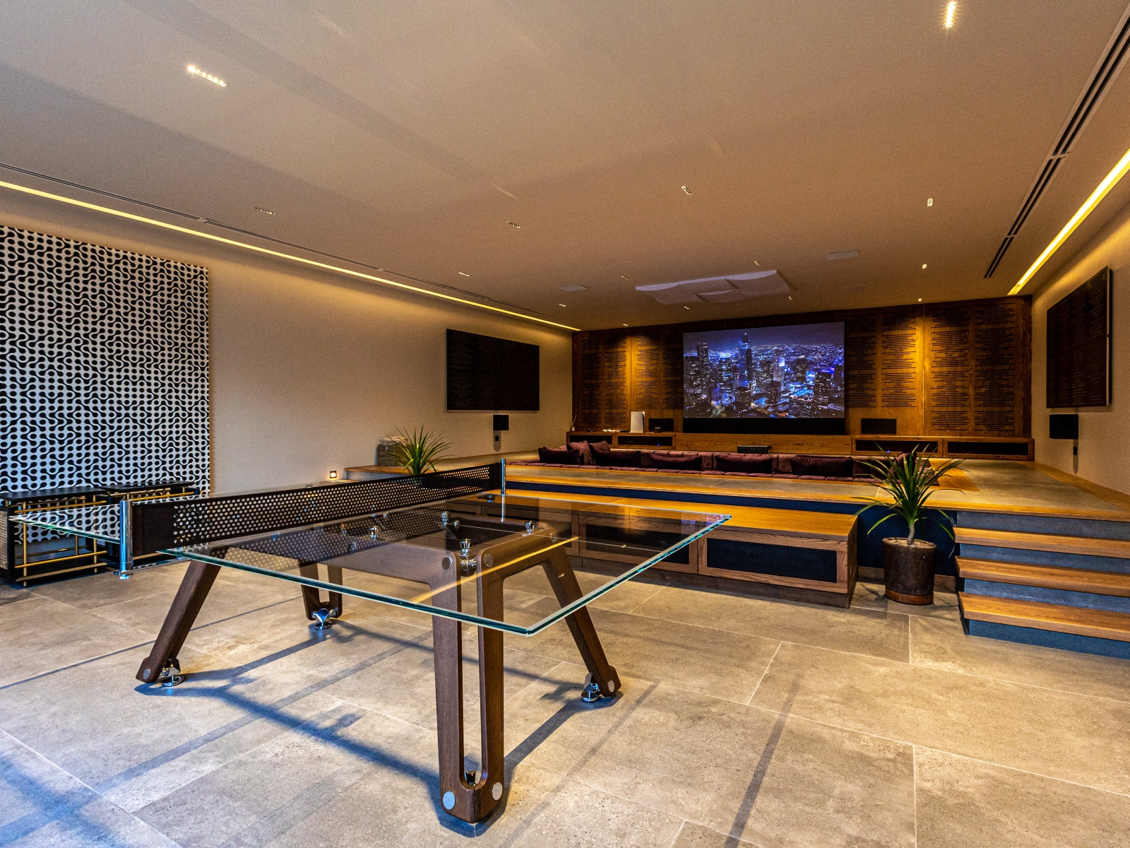 In this luxury Loft, a Multimedia and Game Lounge stands out for its multidirectional position, mixing Middle East tradition with modern media systems. The room is equipped with a 7.1.2 ATMOS Surround, 4K Laser Projection from an Ultra Short Throw Laser 4K Unit, and a 120 inch Floor Rising Screen.