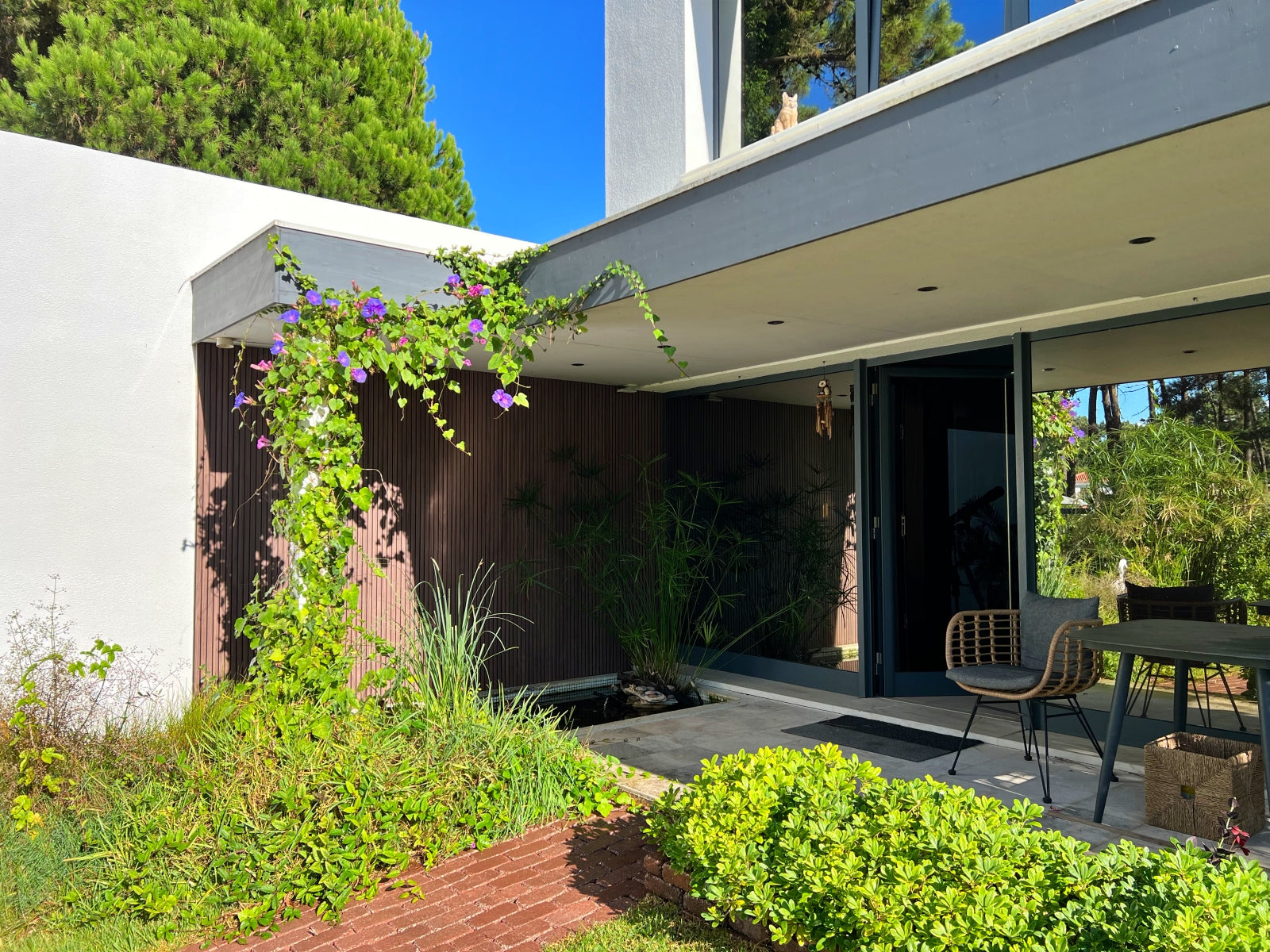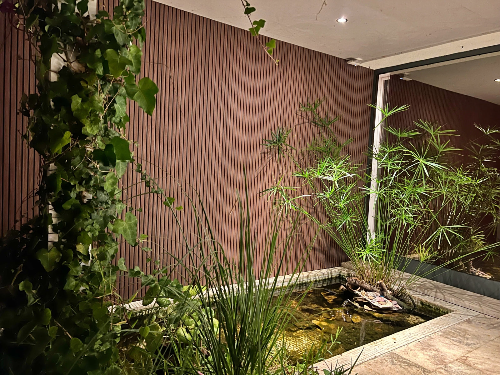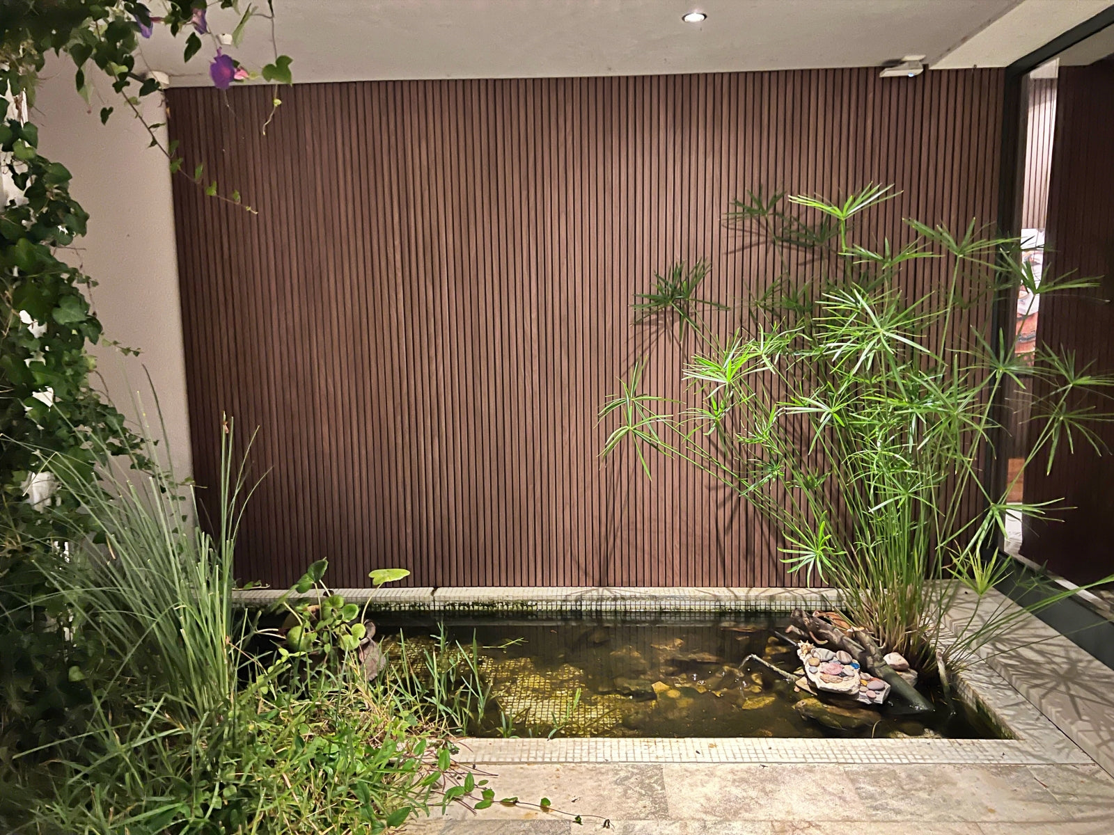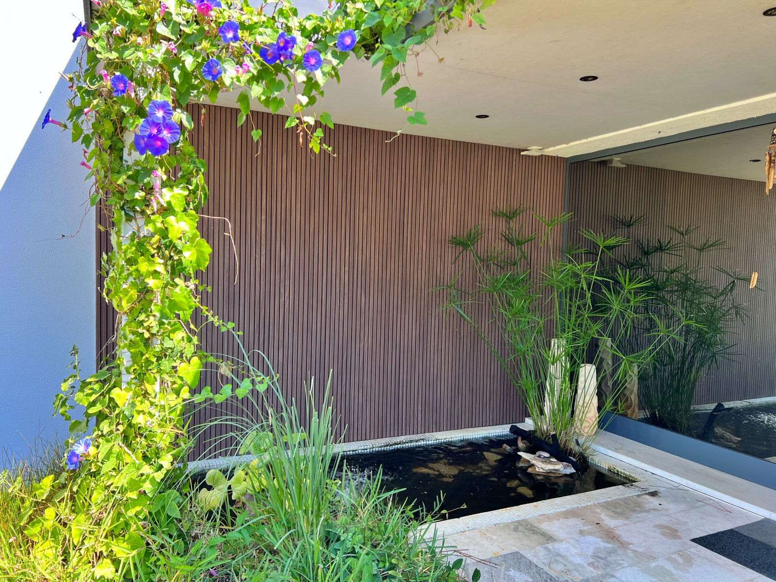 To showcase how the slat wood-look VicStrip panels can be used in an outdoor setting, a wall at the entrance of a house was used to install de panels. The installation was quick and simple, requiring only one person, adhesive glue and a cutter, as it can be seen on the video.