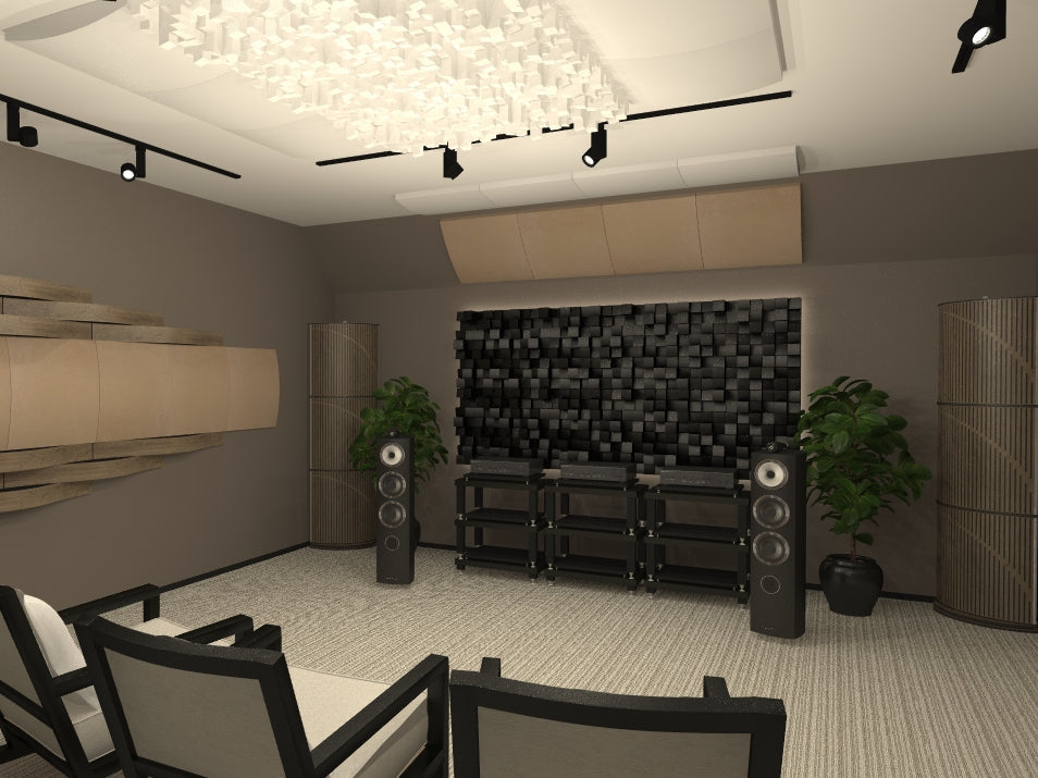 The room was treated according to a concept developed by the Acousticians and Designers from Vicoustic's Project team. The experts took into consideration the room's reverberation time, first reflection sounds and bass response, and presented it in a realistic concept design to the dealer. The actual room after installation is almost undistinguishable from the concept.