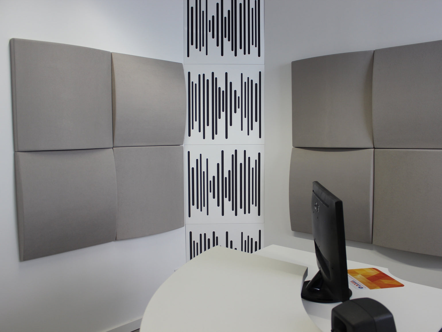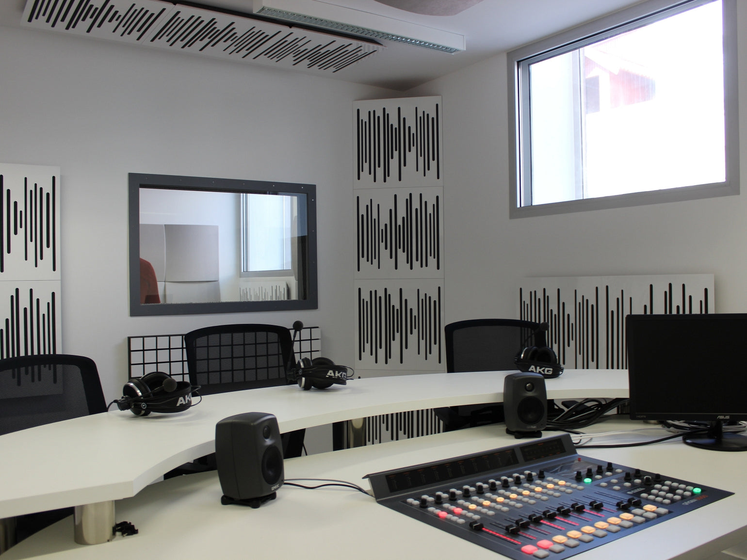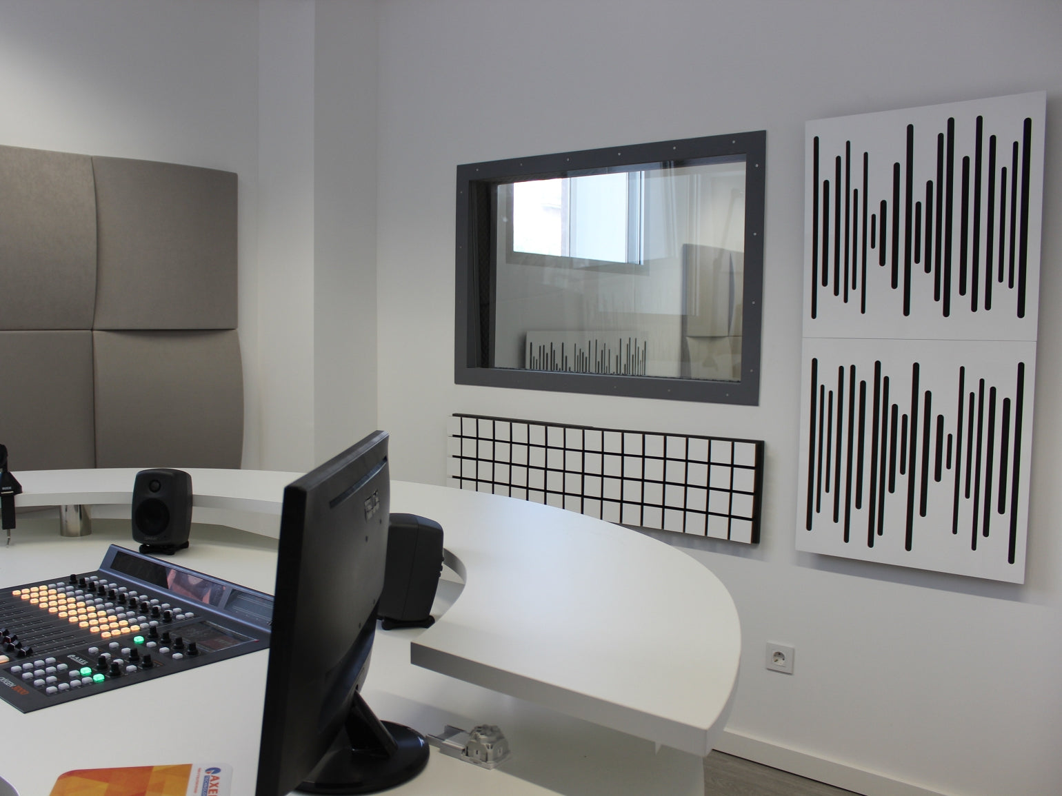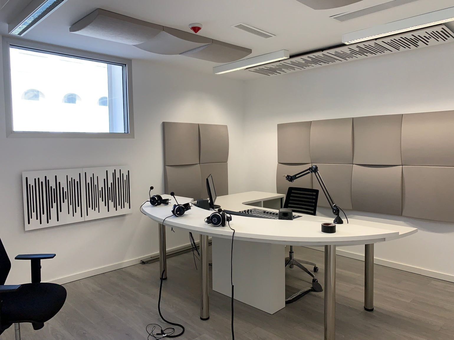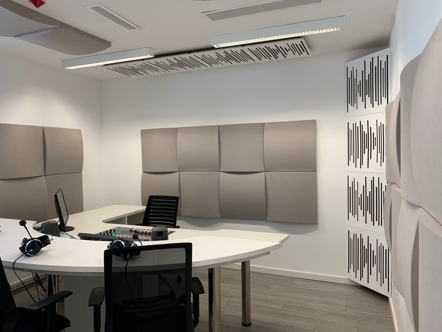 The acoustic treatment recommended by our team of experts in these radio studios had the main goal to correct the reverberation, treat the first reflections and control the low frequencies, in order to guarantee the required sound quality. We chose to install Wavewood and Cinema Round acoustic panels on the walls, as well as on the ceiling, with the aim of treating the first reflections and controlling the reverberation time of the room.