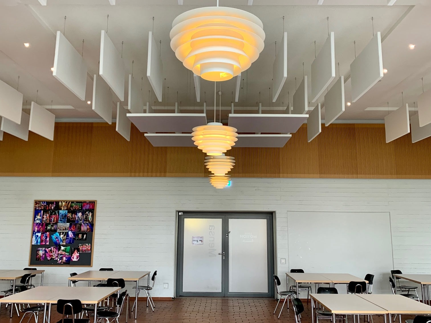The all-day school has its own cafeteria with a canteen for students, teachers and staff. Although the canteen was already equipped with acoustic elements, the wall components already installed did not have any significant effect in terms of reverberation, reflection and sound in the large area. Especially at lunchtime, when there were up to 350 visitors, a conversation between the clatter of plates and cups was mostly incomprehensible and difficult.