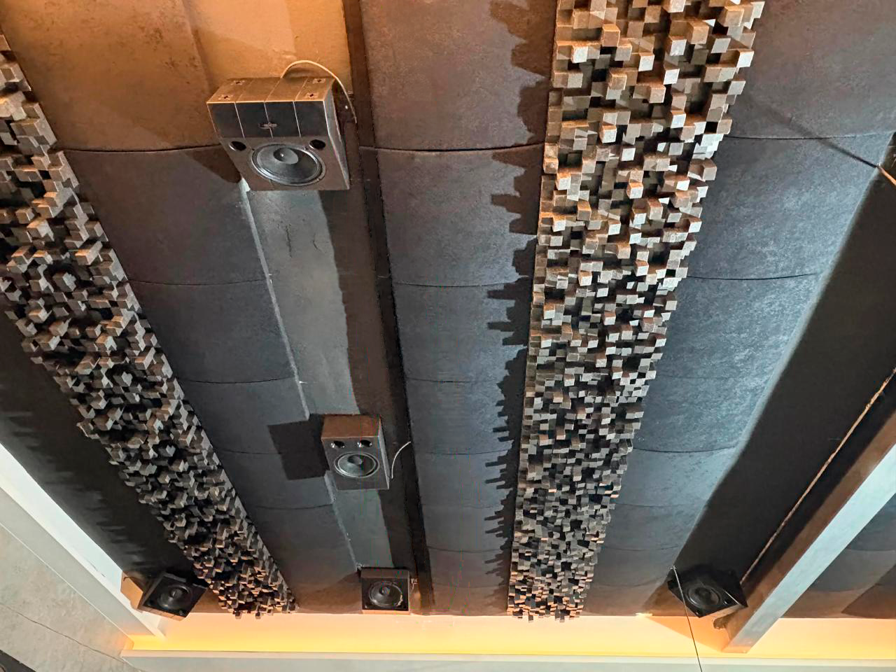 To manage vertical reflections without drawing attention away from the film, the ceiling features a rhythmic, high-performance layout. Rows of Multifuser DC3 (now evolved into the Multifuser DC4) are glued directly to the ceiling, interspersed with rows of Cinema Round Premium in a deep Black finish.