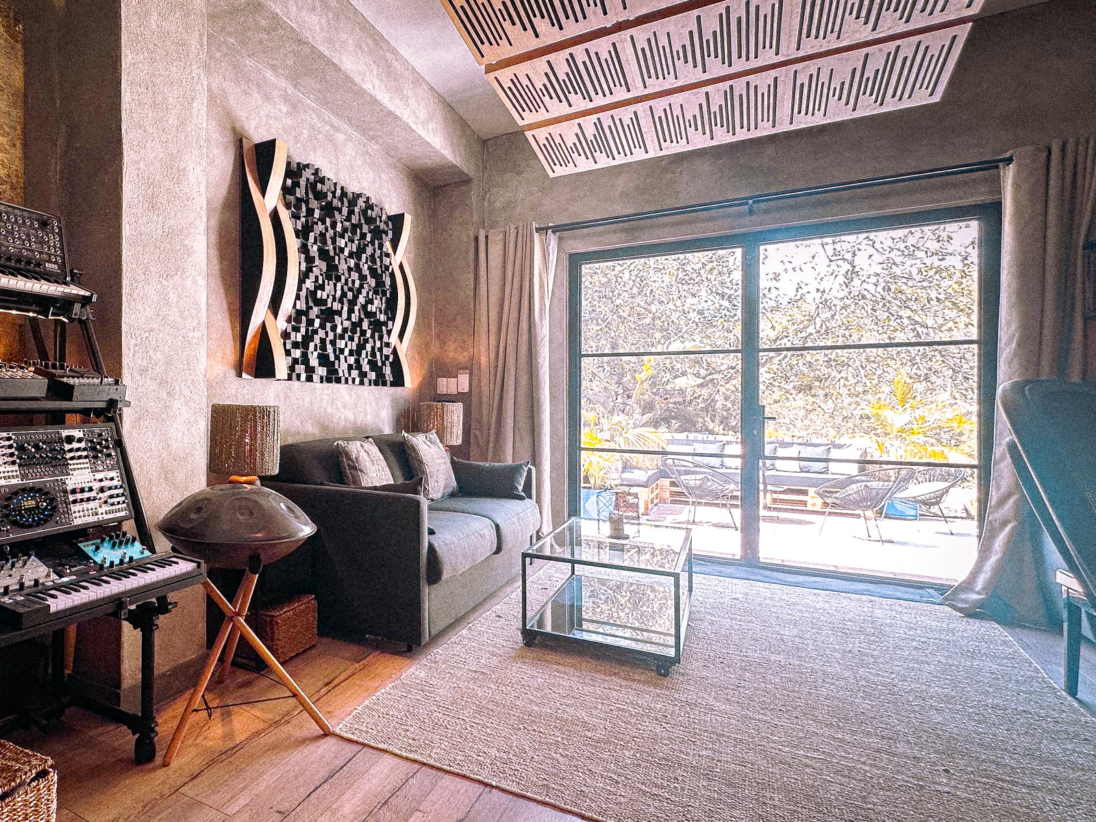Conveniently situated between the charming village of Santa Gertrudis and the bohemian sunset beach of Benirras, this studio is the brainchild of composer, sound engineer, and architect Coco Francavilla. She envisioned a space that goes beyond mere music production, offering a haven for creative synergy, interdisciplinary collaboration, and holistic sonic experiences deeply connected to nature.