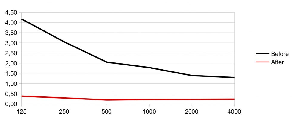 Before the adaptation, the room had extremely unfavorable acoustic parameters. The terrible rumbling and incredibly long reverberation time were not optimistic considering their size. The RT was over 4 seconds at 125Hz and the average RT was at 2.29s.