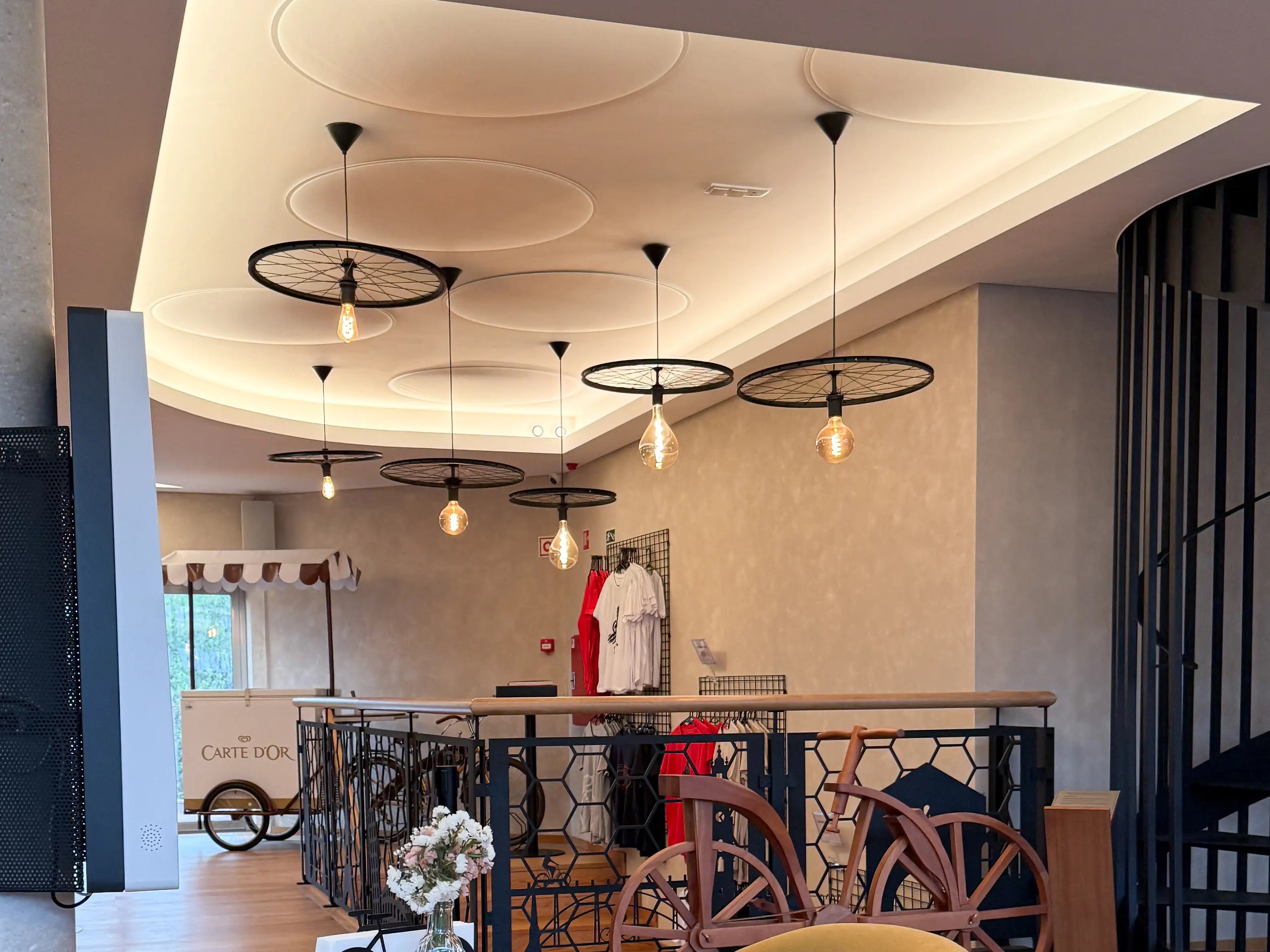 - Sinergia circular com ViCloud VMT 3D: Os painéis ViCloud VMT 3D Round Colors (White) complementam os criativos lustres em forma de roda de bicicleta no átrio. Estas elegantes "nuvens" controlam a acústica num espaço de pé‑direito elevado, funcionando como uma extensão natural do design de iluminação.